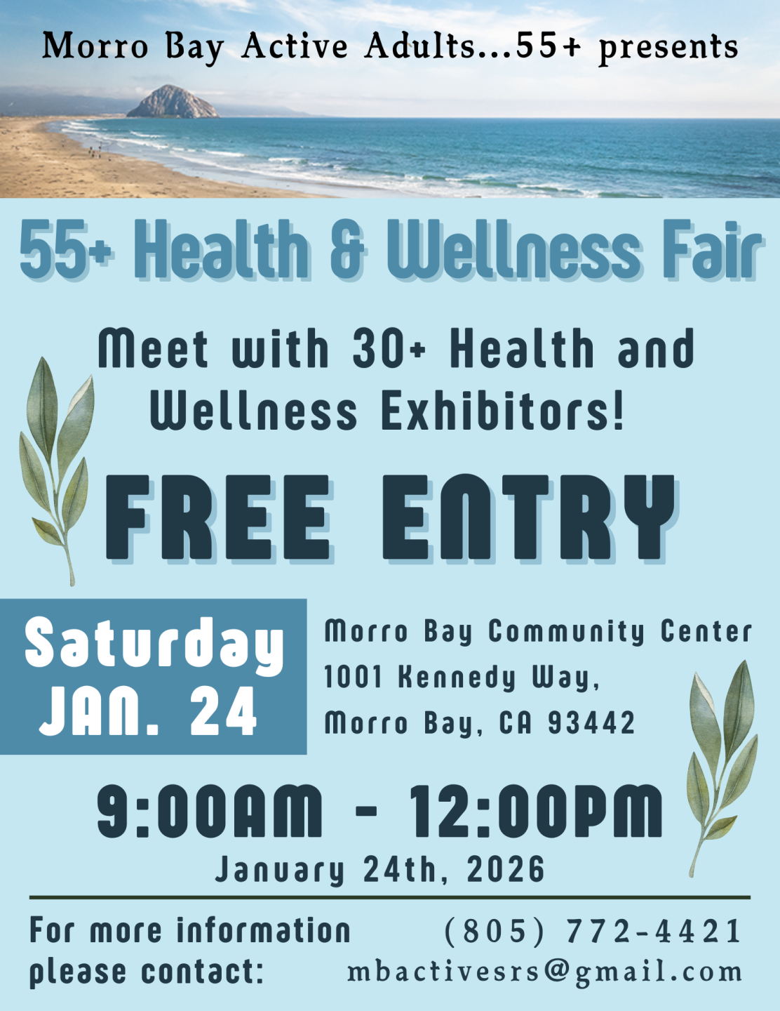 This Saturday, the 55+ Health and Wellness Fair will showcase more than 40 exhibitors that will cover all areas of senior health and wellness. This will be their largest event to date and will include information on senior housing, transportation, mental health, recreation, finances, hospice care, senior nutrition, physical therapy, exercise classes, free tax preparation and so much more! The fair runs from 9 a.m. to noon in the Morro Bay Community Center.