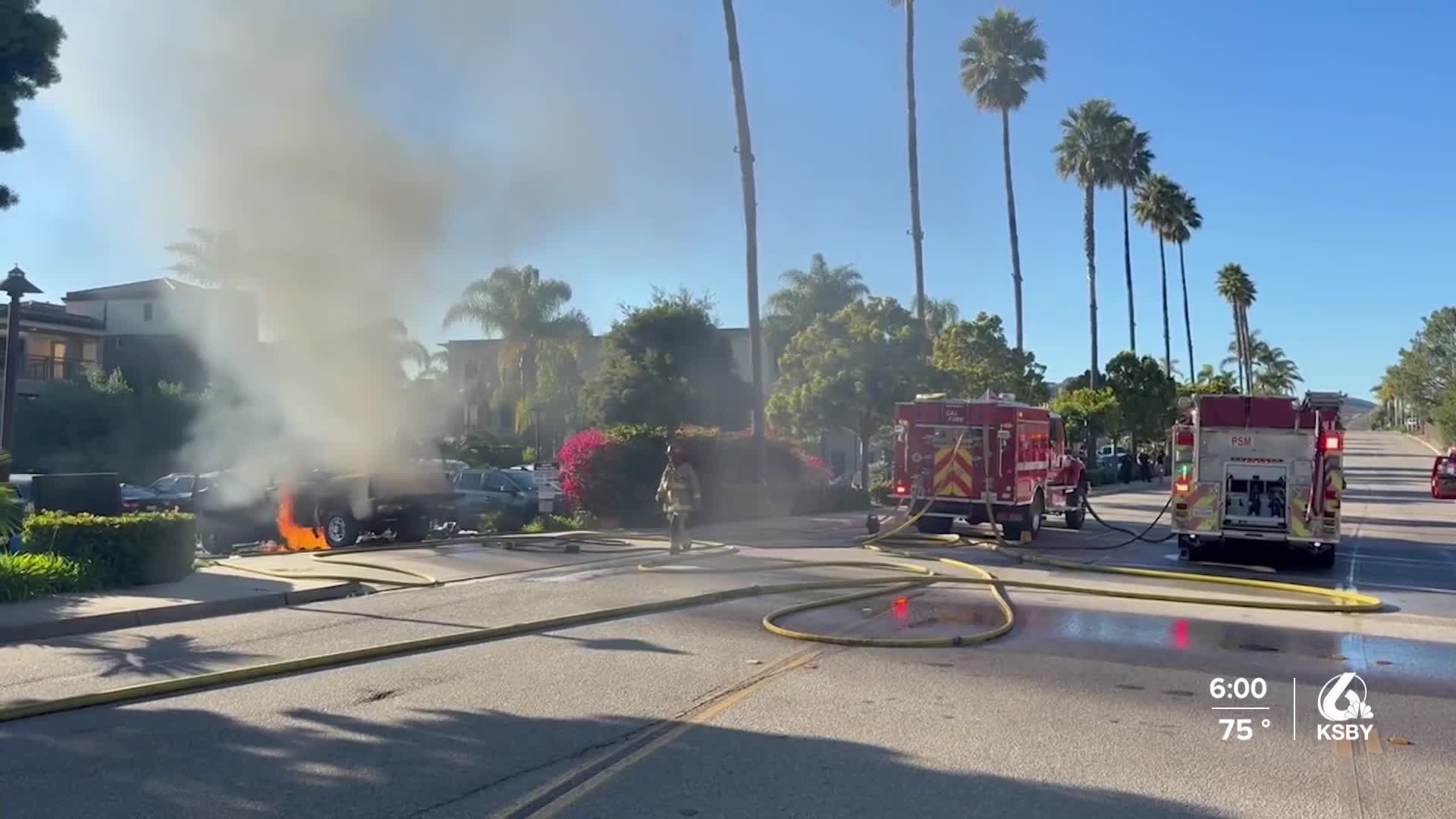 Firefighters said a 30-gallon tank under the back seat of the pickup truck was making the fire difficult to put out.