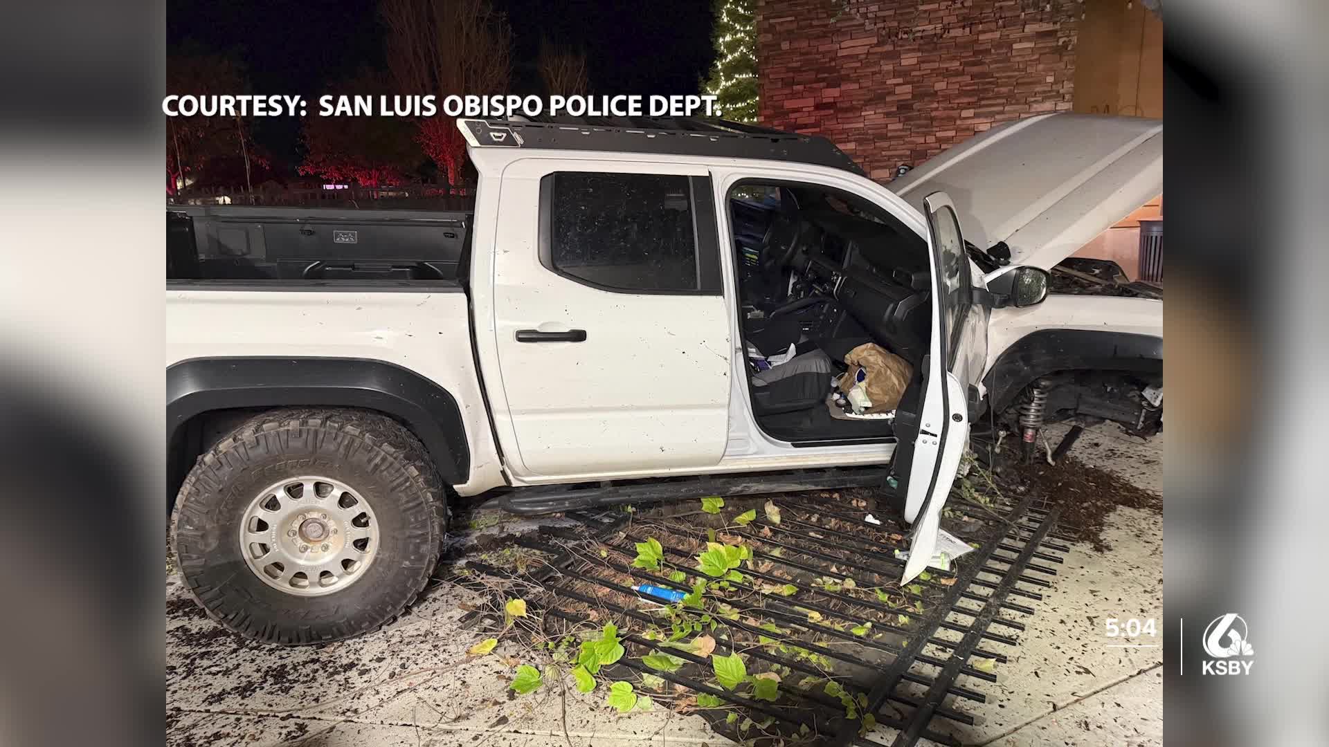 San Luis Obispo police say the driver of a pickup went off the road, crashing through a fence and into the patio area of SESLOC Credit Union.