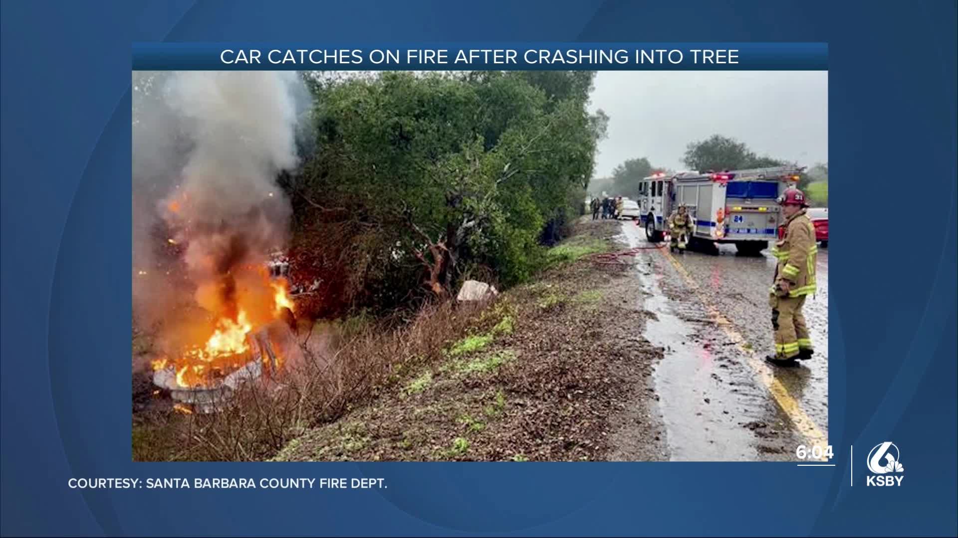 A car crashed into a tree and caught on fire on the southbound Hwy 101, north of Highway 154 in Santa Barbara County, on Saturday, Jan. 3 at around 10:20 a.m.