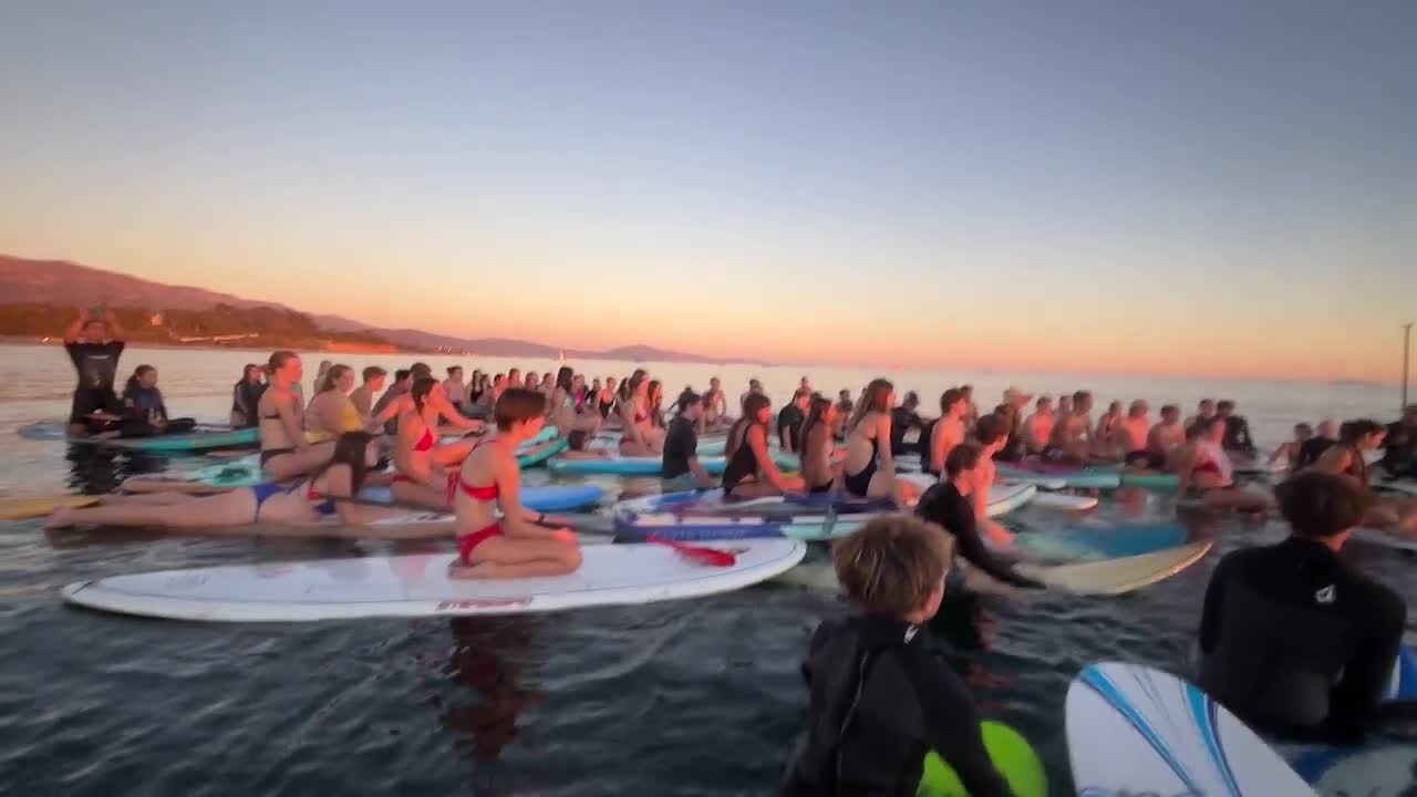 The group paddled out together, forming a circle beyond the break as they shared memories and released flowers into the water.