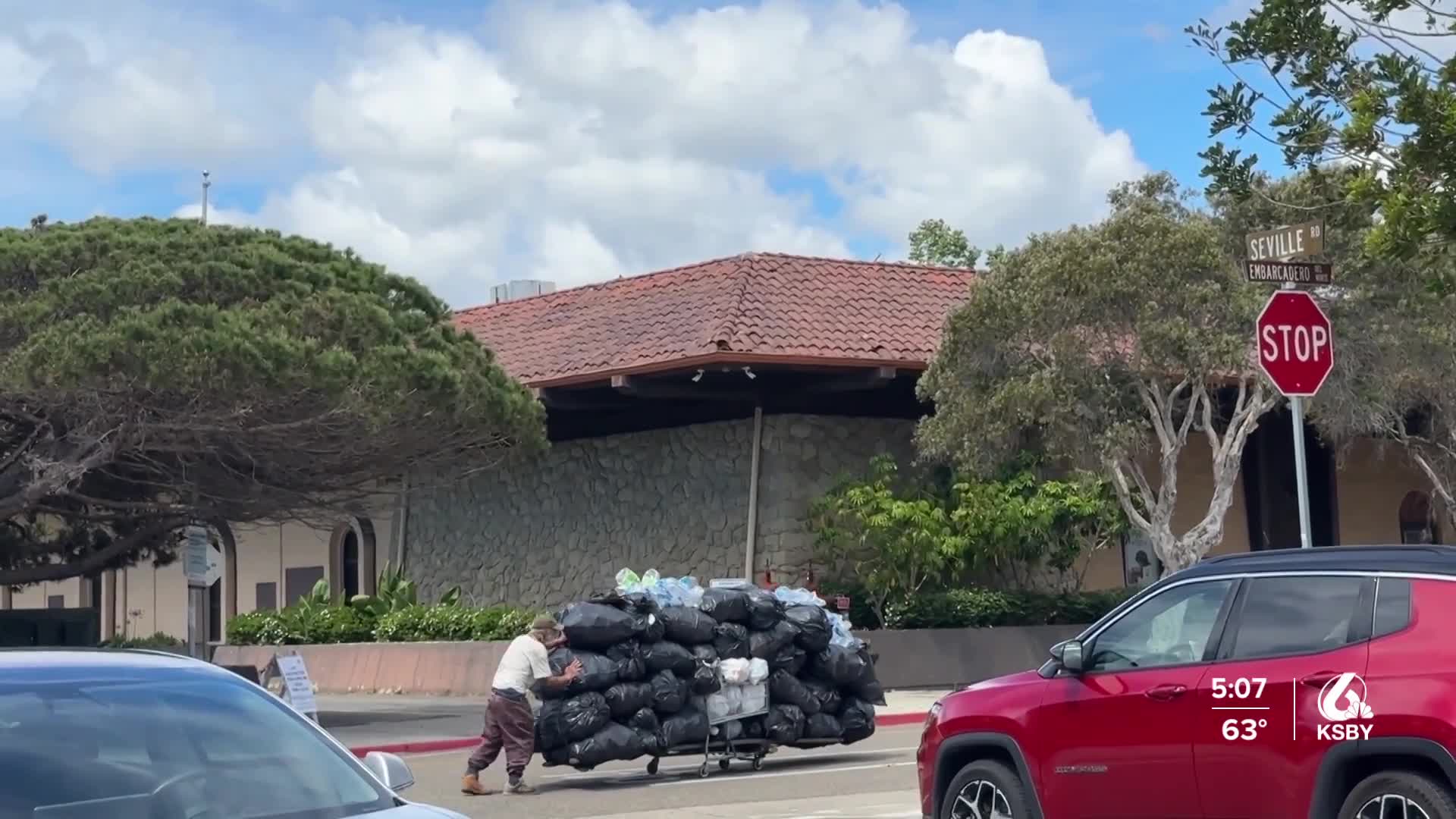 Johnny Paruts, who is experiencing homelessness, comes to Isla Vista to pick up trash for recycling, earning a small amount of money while cleaning the streets.
