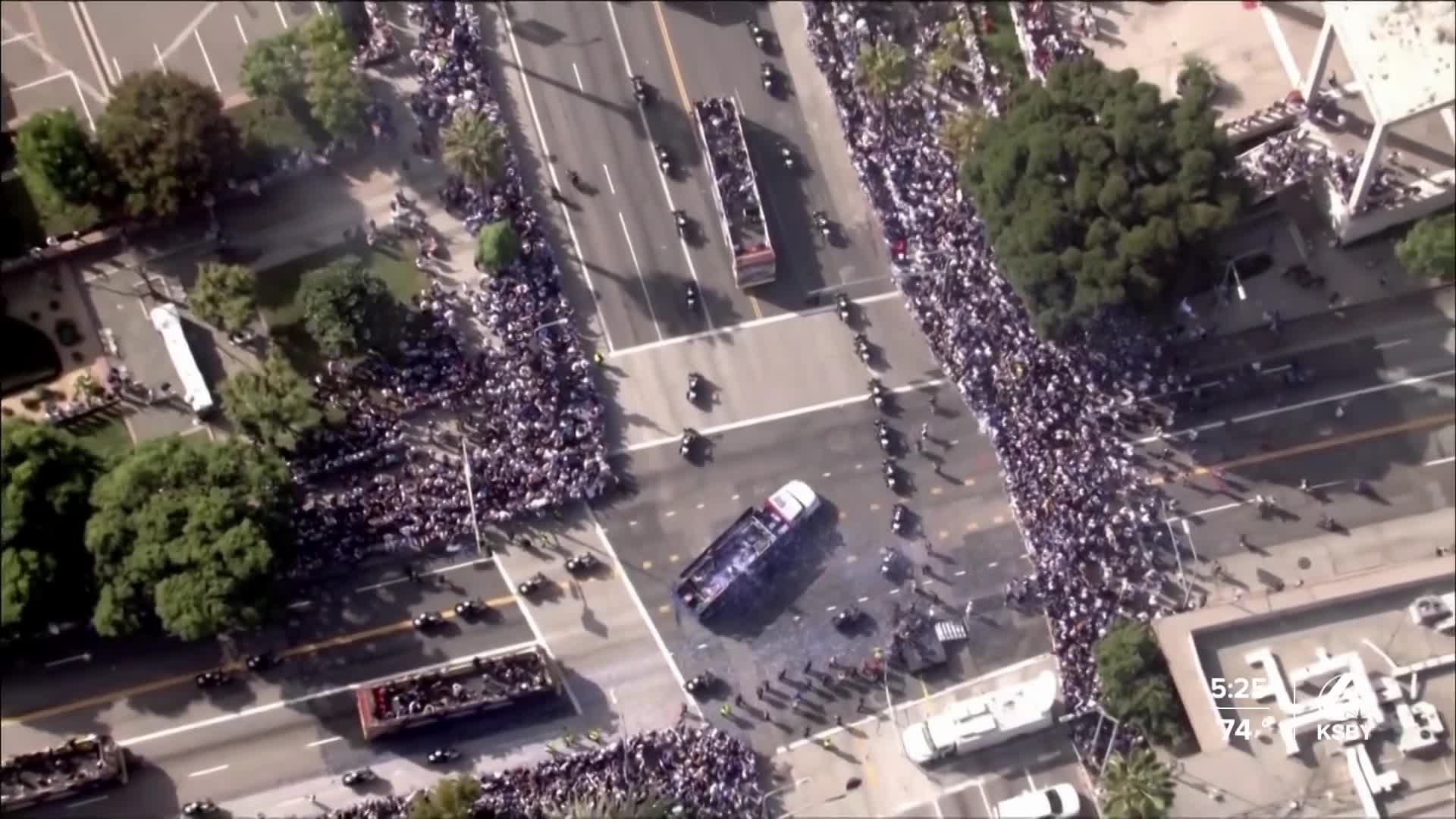 Blue-and-white confetti blew from a truck rolling between the buses, which were filled with family members of the players, including newly retired Clayton Kershaw and his four children.