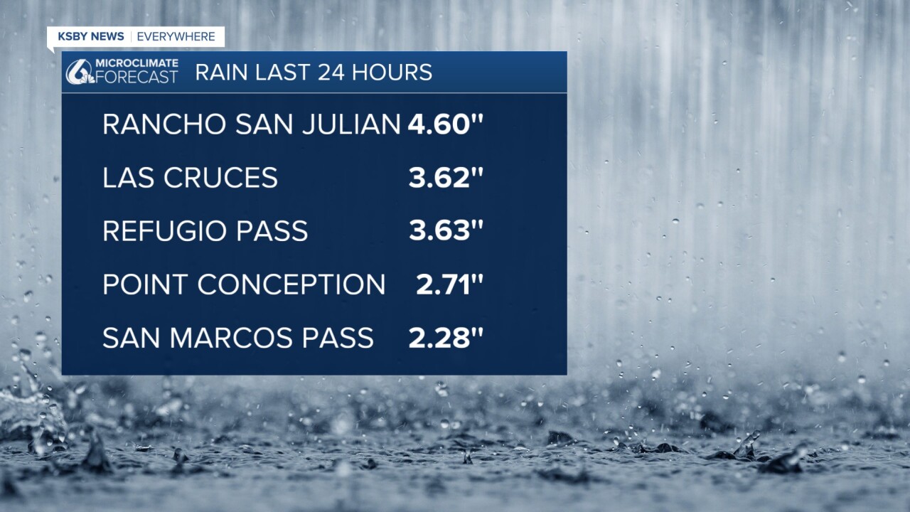 Lets start with a look at what we saw overnight. As of 5:45am this morning, it is still raining in Santa Barbara County and there are a few isolated showers in San Luis Obispo County. These are the 24 hour rain totals as of 5:45am, and Meteorologist Vivian Rennie will have updated totals for you this afternoon.