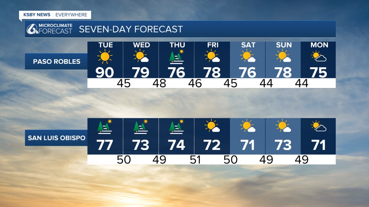 Temperatures will cool a bit tomorrow in Paso Robles and San Luis Obispo. Here is a look at our 7-day forecast: