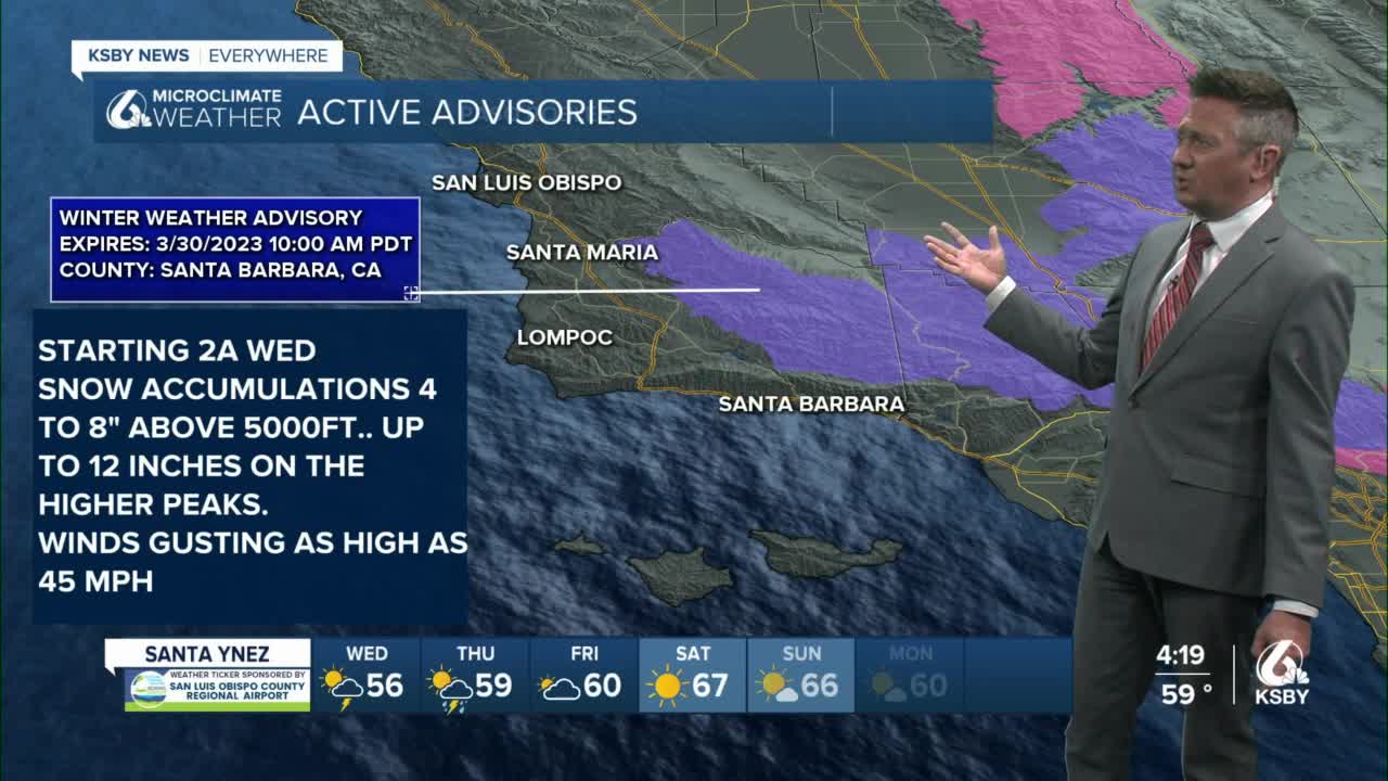 Snow levels will drop down to about 5000ft. Above that accumulating snow is likely and higher winds. A winter weather advisory has been posted for the Santa Barbara County Mountains.