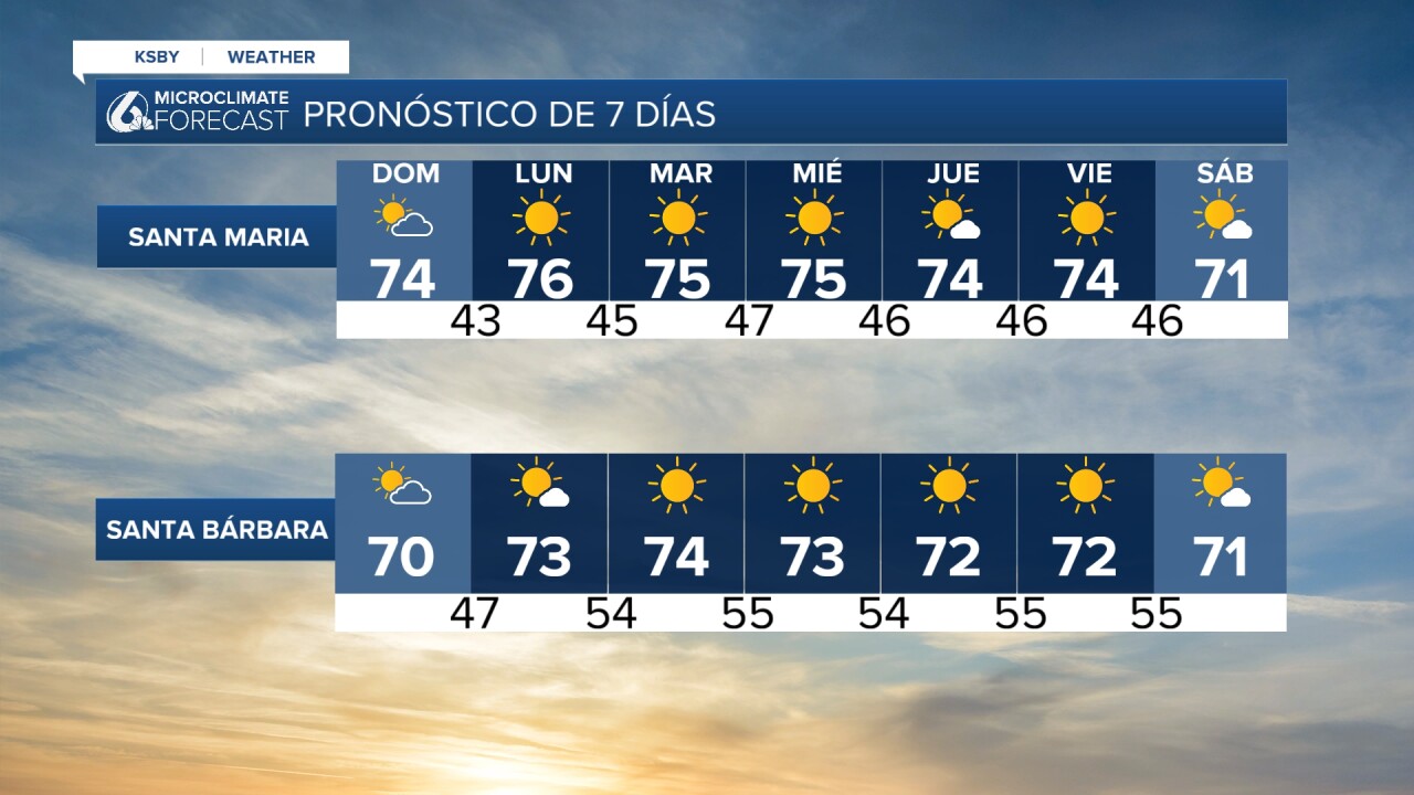 El día más caluroso para Santa María será el lunes. Las temperaturas en los 70 continuarán durante la semana laboral.