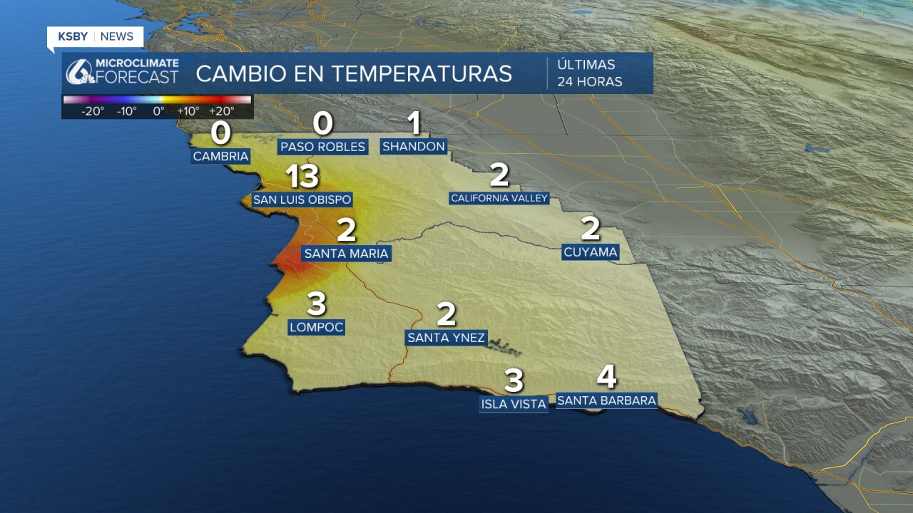 En la última semana, observamos temperaturas frías en los valles interiores, que fueron la causa detrás de varios avisos de congelación emitidos. ¡Por suerte, estos avisos ya han expirado! La imagen a continuación muestra el cambio en las temperaturas que hemos observado en las últimas 24 horas. Estamos experimentando un incremento en temperaturas durante la noche. La ciudad de San Luis Obispo está 13 grados más caliente comparada con la misma hora de ayer, a las 9:30 PM.