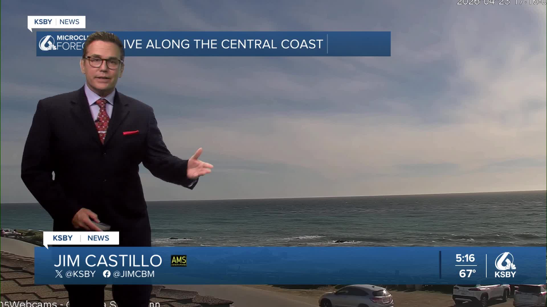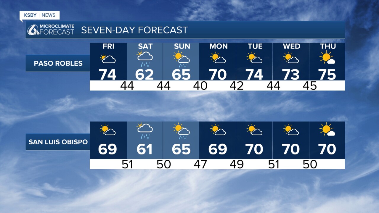 Sunday shows mostly cloudy morning conditions becoming partly cloudy by afternoon. Isolated light showers remain possible, particularly in the Santa Lucia Mountains and eastern portions of both counties. High temperatures in the 60s in most areas.