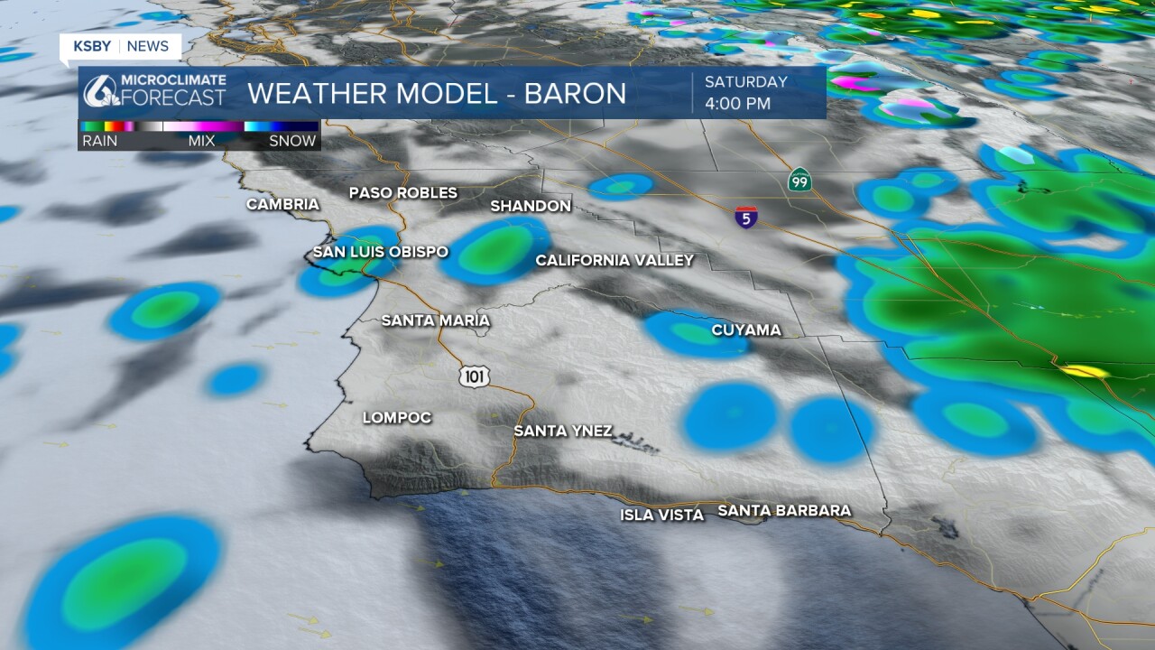 Saturday marks the arrival of our next weather system. Morning hours start mostly cloudy, with the first chances for light rain developing during the day. The Santa Lucia Mountains and higher elevations of Los Padres National Forest have the best chances for measurable rainfall, with amounts generally under one-tenth of an inch. However, orographic enhancement could produce up to a quarter-inch in the highest peaks.