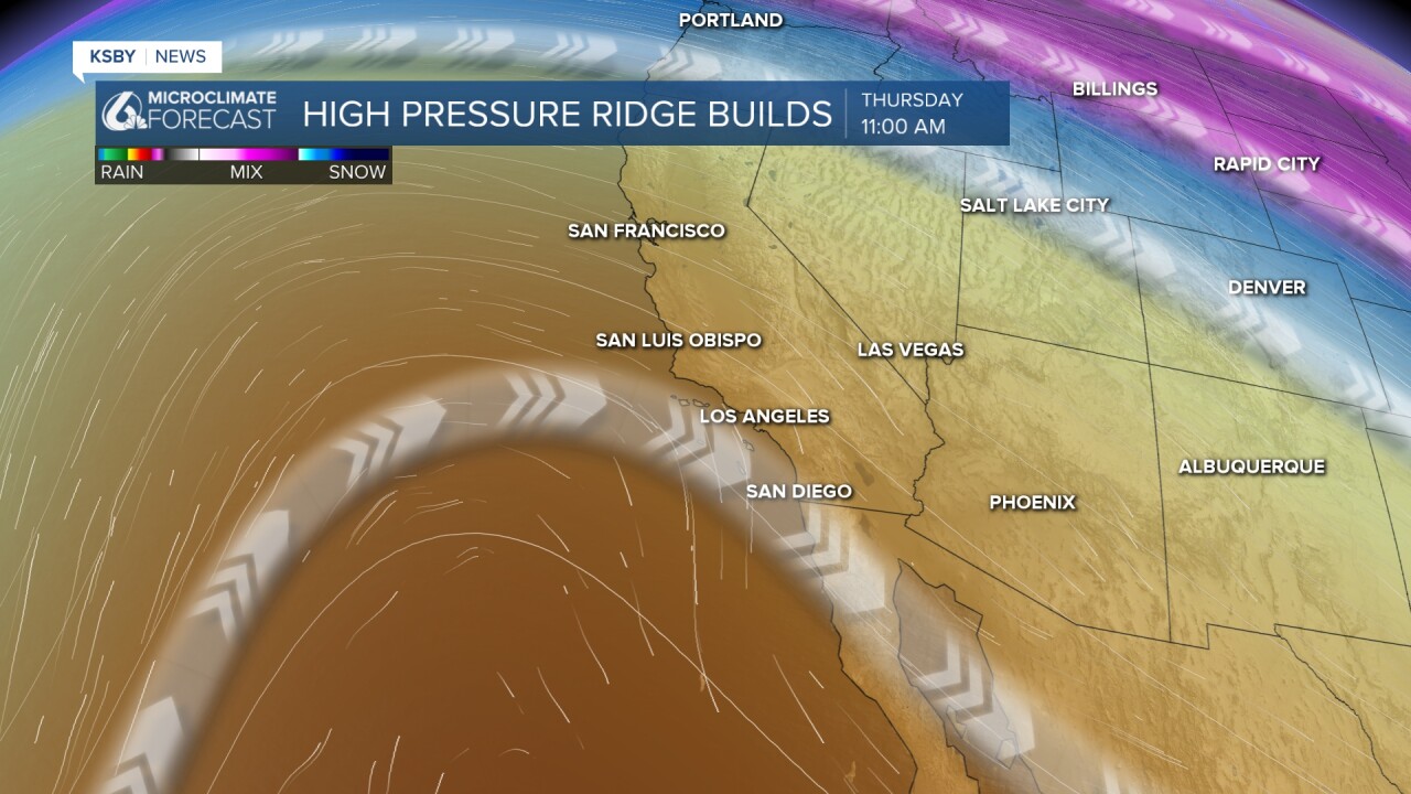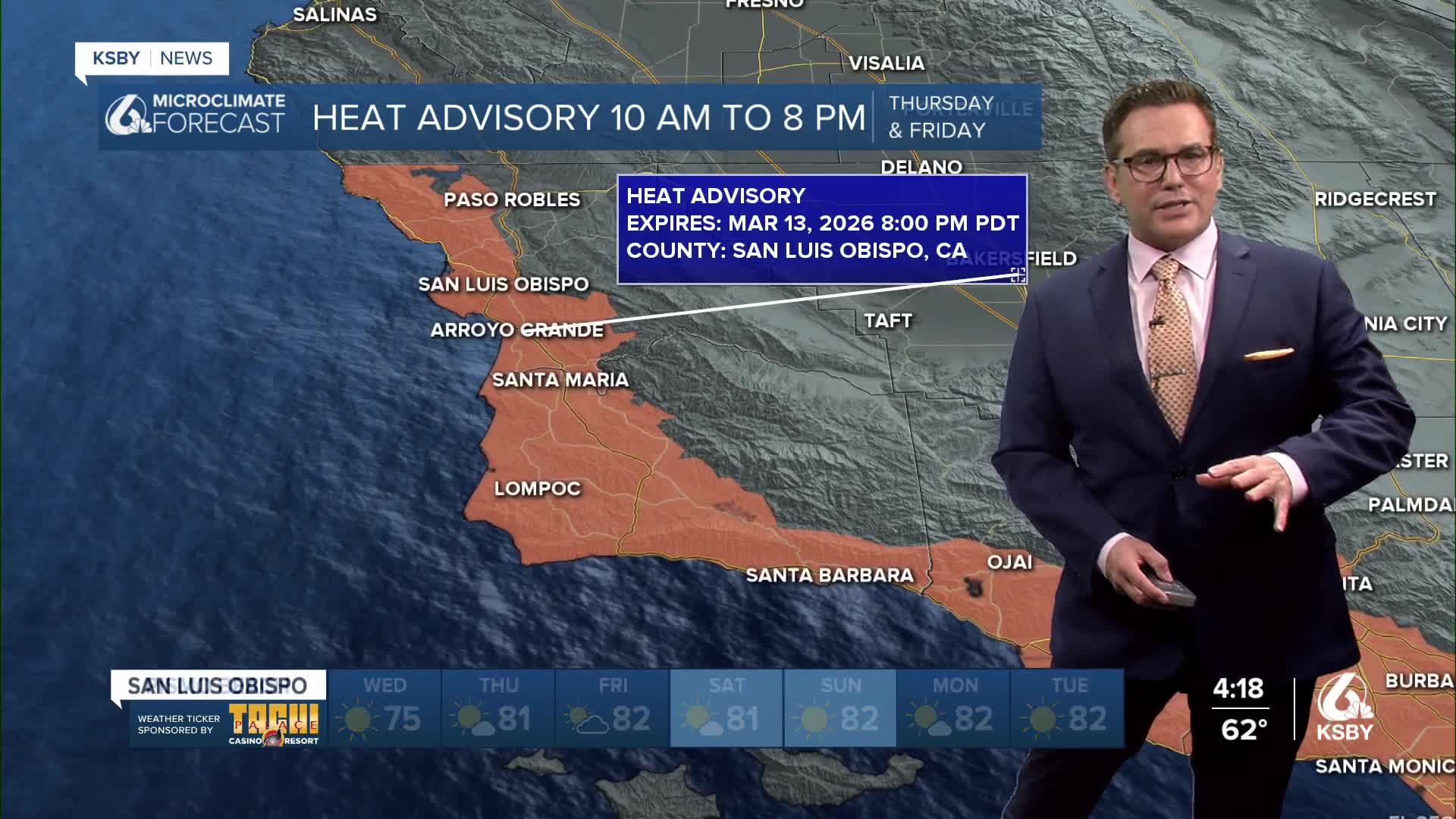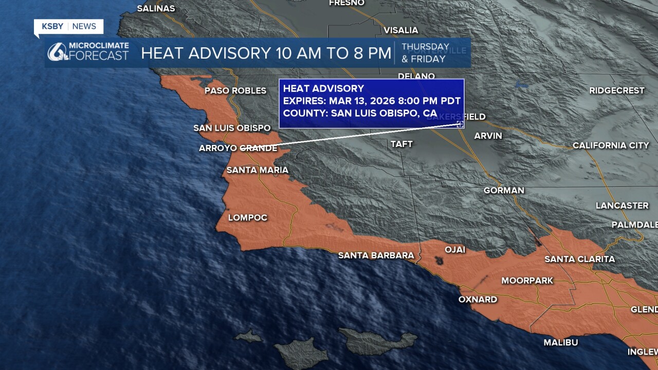 A Heat Advisory begins at 10 am on Thursday and continues until 8 pm Friday; it may be extended as a strong ridge of high pressure builds into the Central Coast this weekend and into next week.