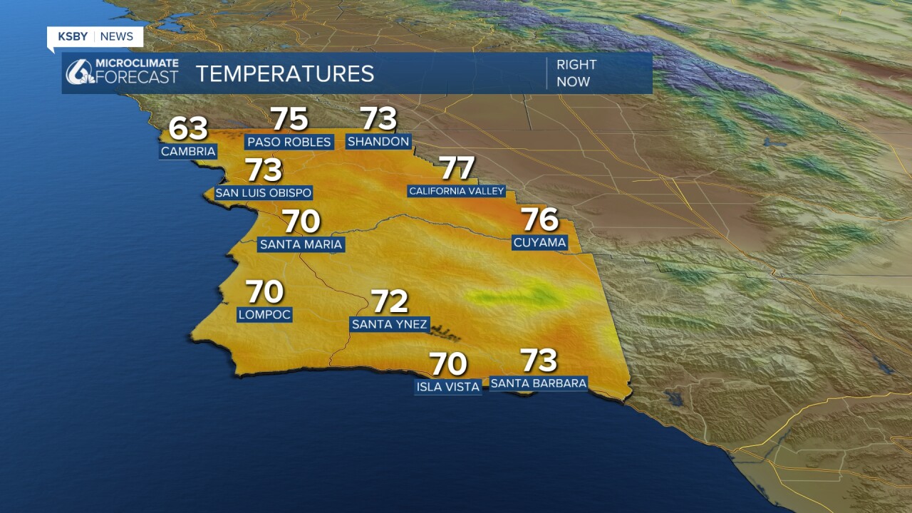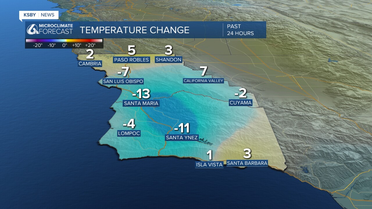 Hard to believe we are kick-starting a cooling trend! Friday was the warmest day of the week for the Central Coast. We're still warm today, just slightly cooler. This image shows the change in temperatures when compared to the same time period 24 hours ago.