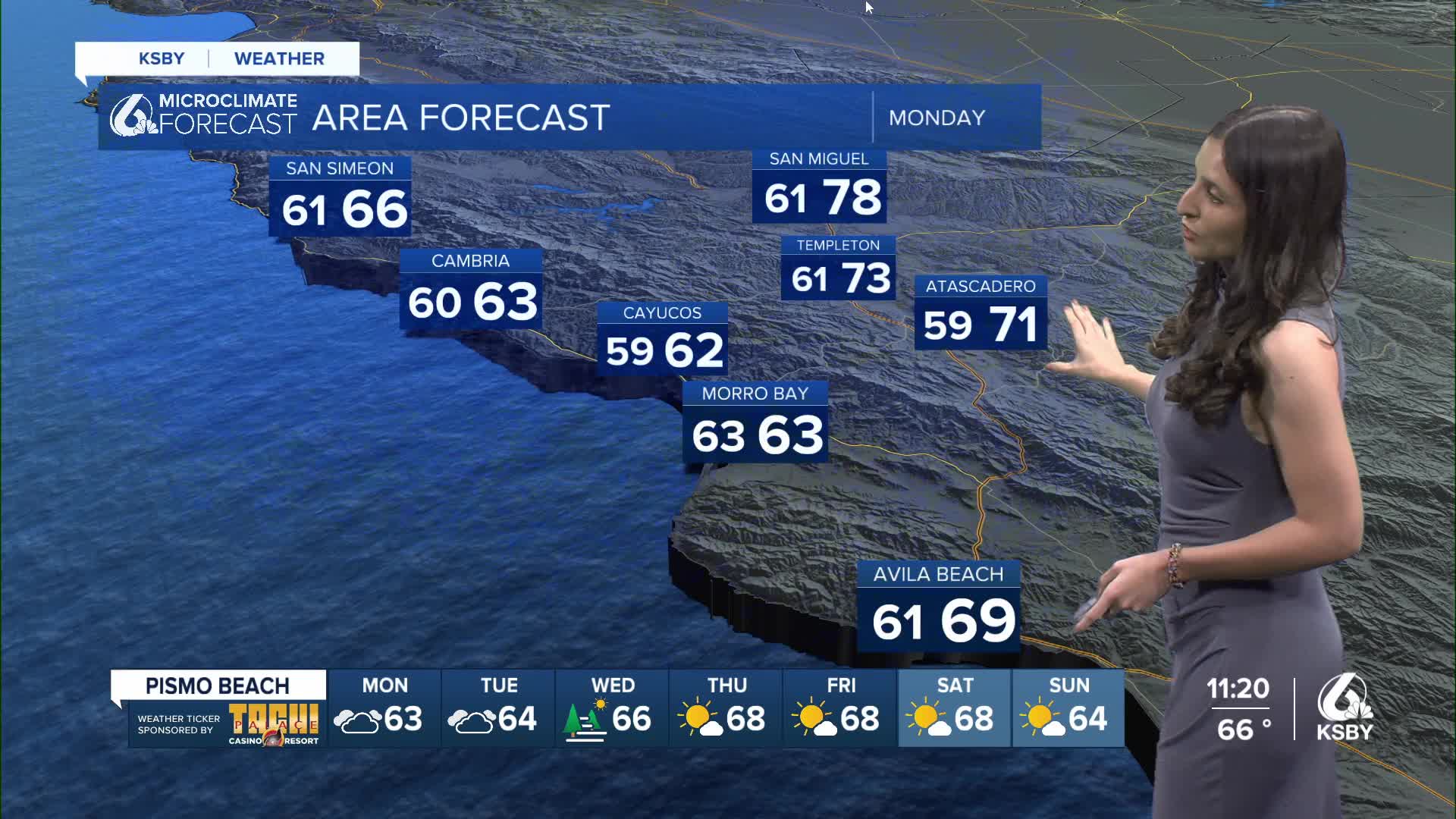 The Central Coast can expect more of the same for Monday. Inland valleys will be slightly warmer compared to our coastal communities, but still quite cool. Overnight lows will range between the upper 50s and the low 60s.