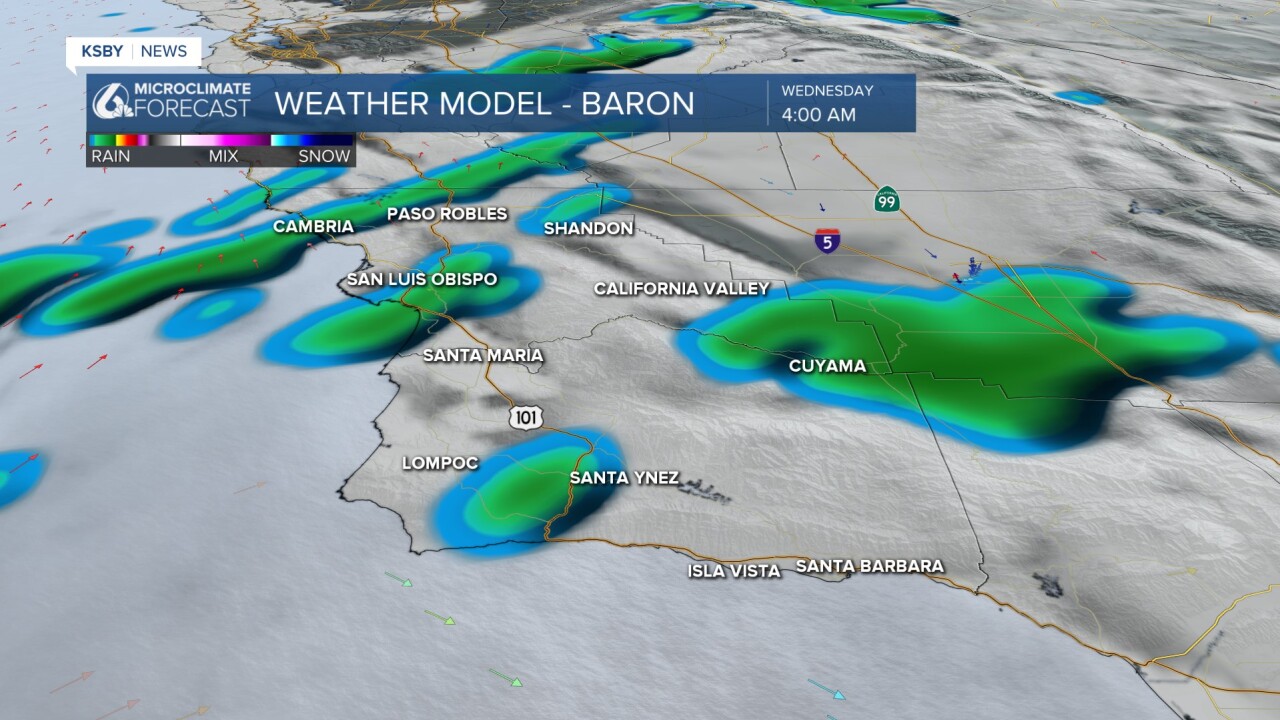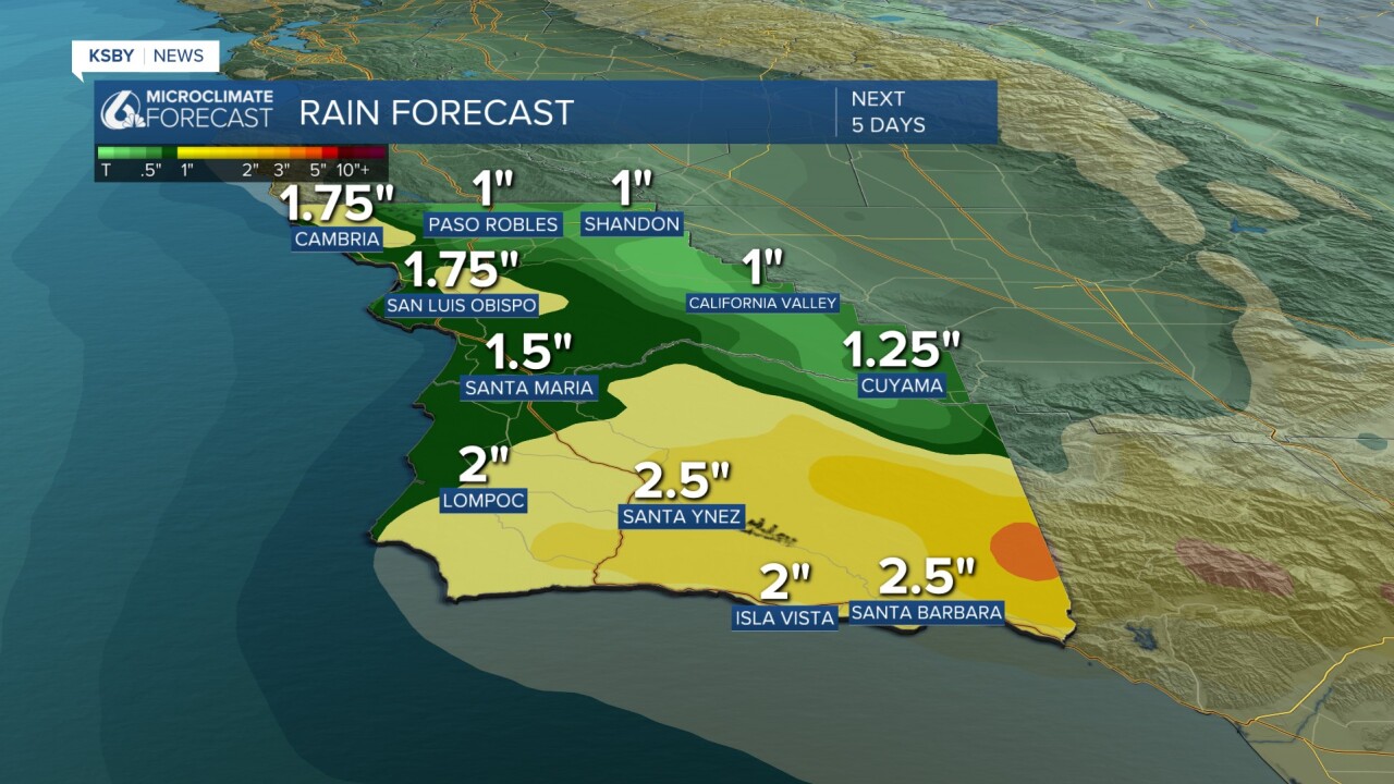 Interior valleys look to have the least, but still are expected to pick up around an inch of rain. Coastal valleys and beaches will be between 1.5" and 1.75" with the ridges and peaks looking closer to 2". The south coast and Los Padres National Forest will see the most, with some spots up to 2.5" of rain between Wednesday morning and Saturday afternoon.