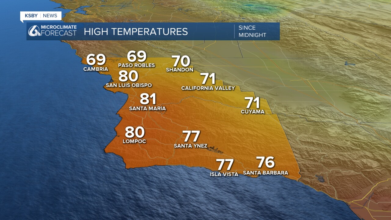 We had warm, but slightly cooler conditions on Thursday, with highs in the 70s to around 80. A bigger cool-down arrives Friday as onshore winds dominate, bringing coastal clouds, areas of fog, and high temperatures 5 to 10 degrees cooler.