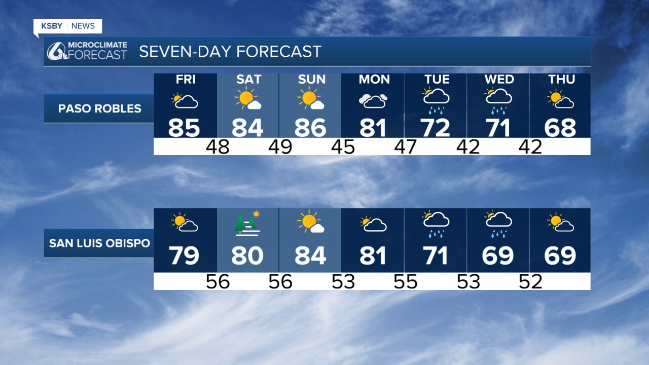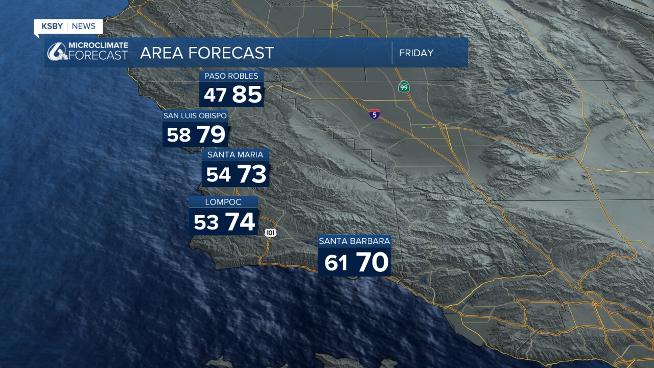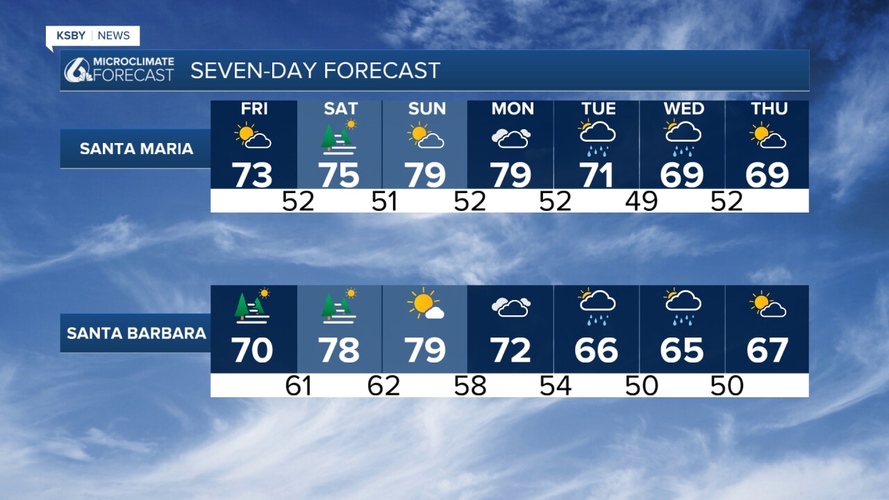 Now through Friday: Expect warmer-than-normal temperatures inland, while coastal areas, especially south of Point Conception, stay cooler thanks to a lingering marine layer through Friday. Some gusty northerly winds are possible tonight into Friday morning, mainly over the mountains and southern Santa Barbara County. Many areas will still be breezy tonight with a north wind at 15 to 25 mph, including San Luis Obispo.