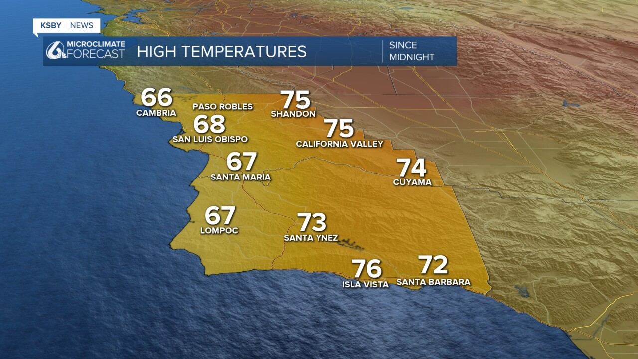 - Coastal and valley areas will see temperatures drop 3-6 degrees from yesterday's highs