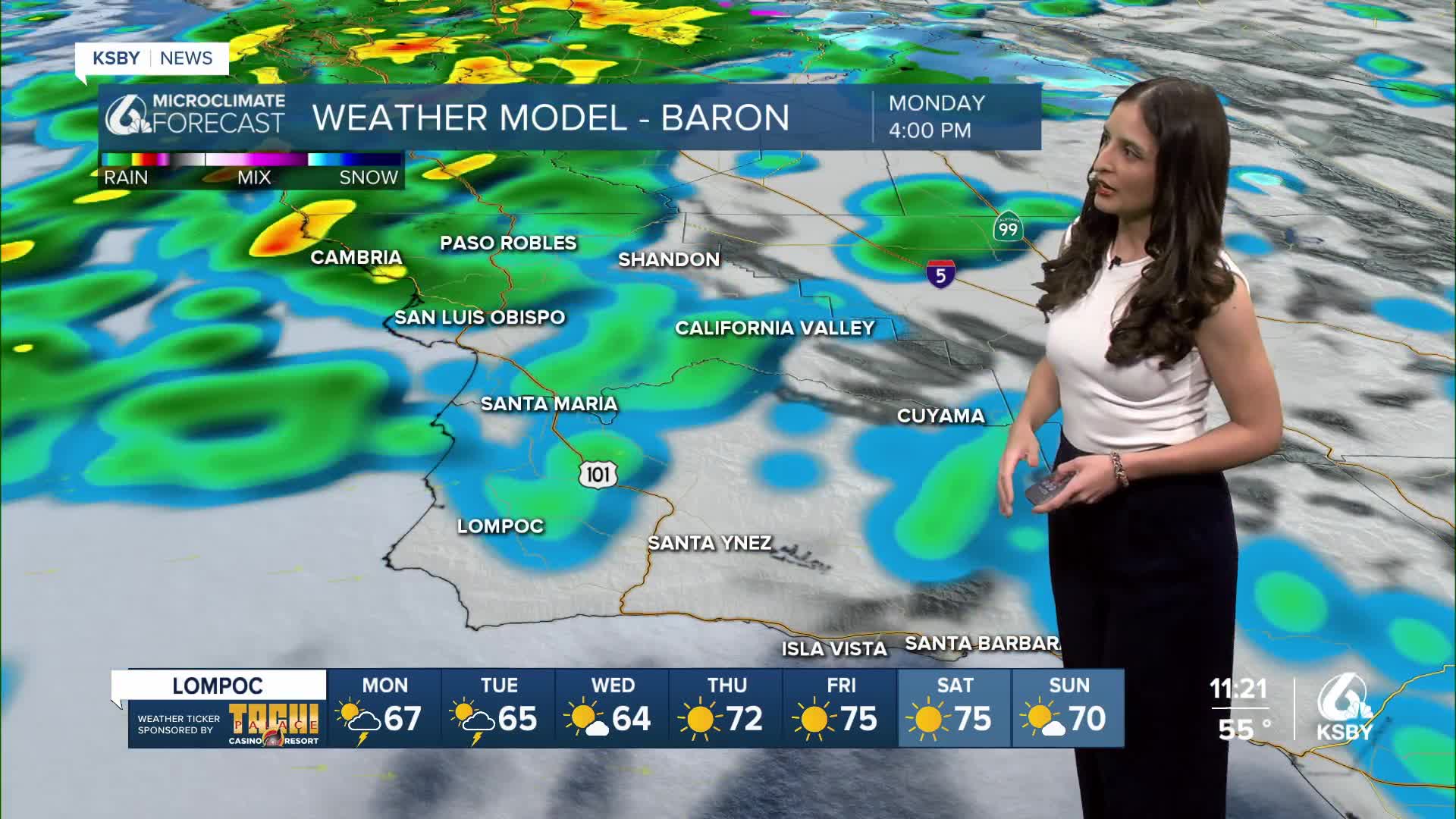 Comenzamos el lunes con nubes, pero esto cambia a lo largo del día. Las comunidades localizadas en la región norte del condado de San Luis Obispo, serán las primeras en recibir lluvia en la tarde. Al principio, estas lluvias serán dispersas, pero se intensificarán al atardecer.