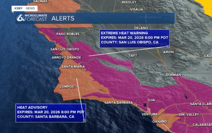 Thanks to this heat, there are a few alerts in place. First, for the interiors and highest elevations, there is an extreme heat warning in place through 8 p.m. Friday. For the beaches and most coastal valleys, there is a heat advisory for the same timeline.