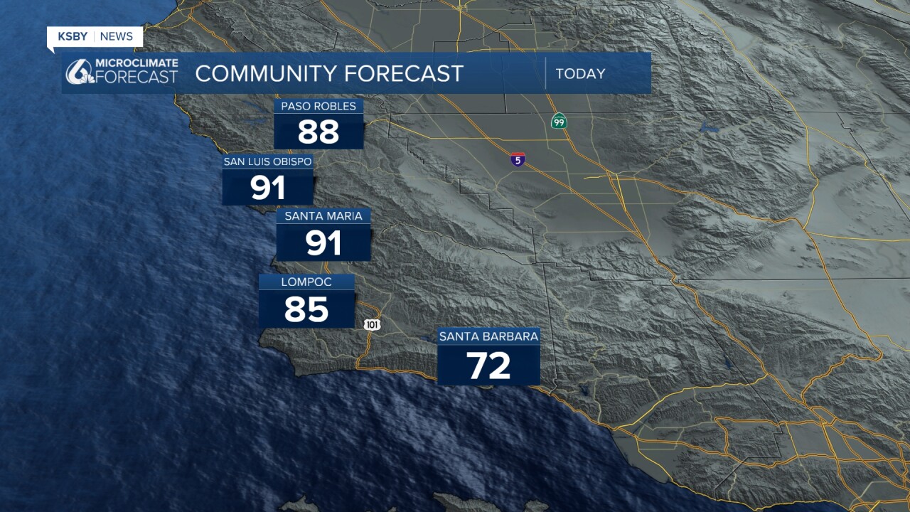Another day of heat is headed our way. Offshore winds are increasing temps signifciantly in the San Luis Obispo area (70 around 6 a.m.). On the other side of the coin is the south coast, where some fog is limiting visibility as well as keeping temps cooler.