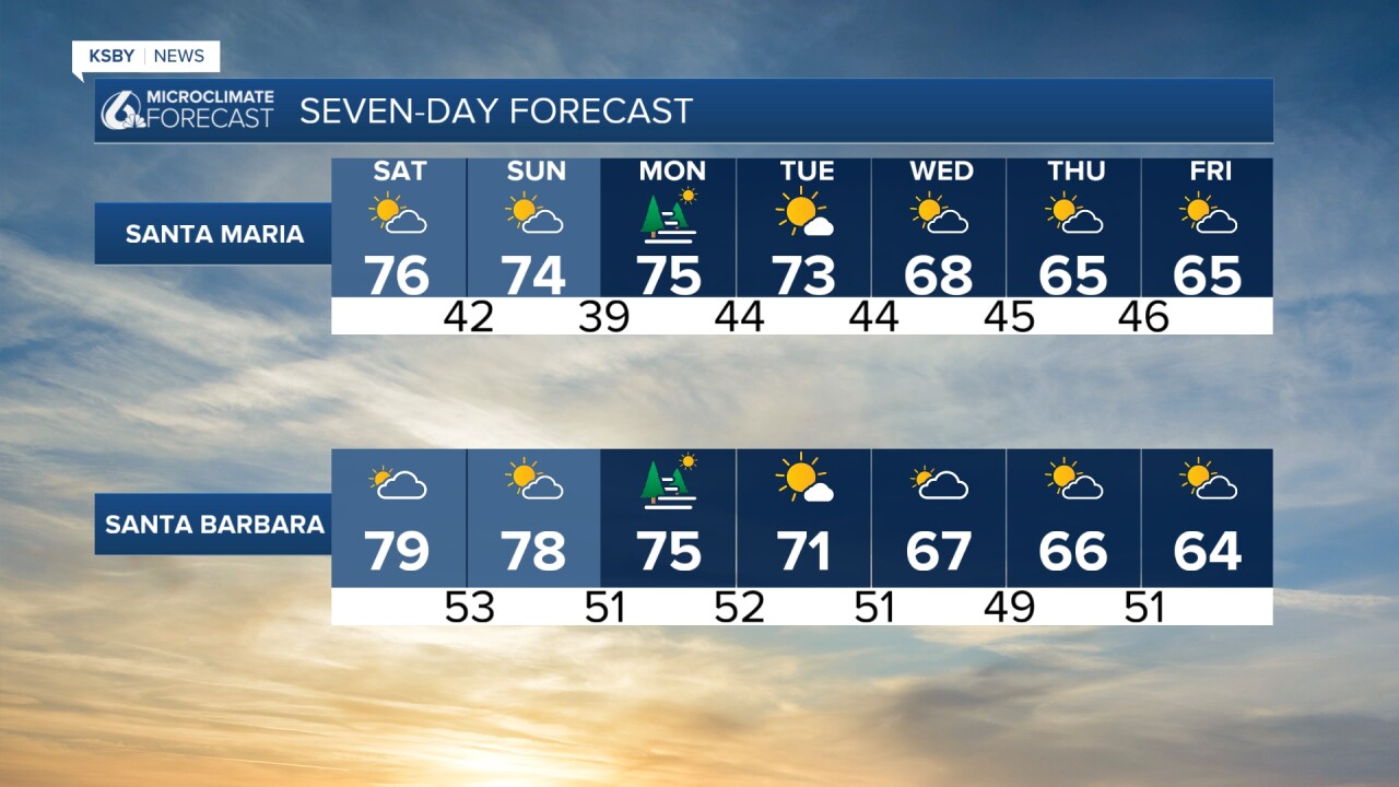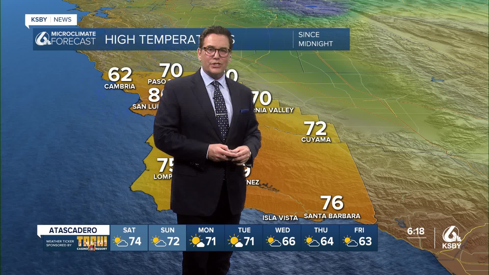 Well above average highs will continue through the weekend for inland areas, and some of the coastal areas will see low clouds and fog holding the highs down into the 60s.