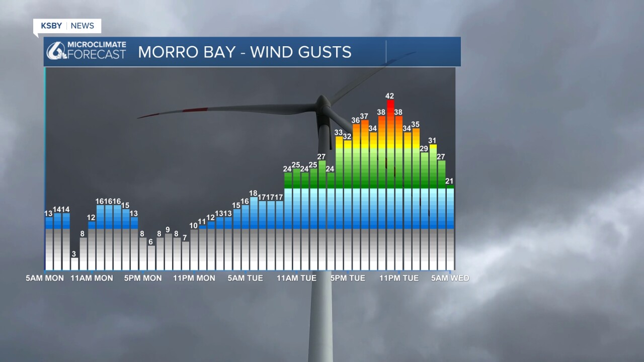 One additional concern with the storm this week are strong winds. Here is a look at the timeline of the winds for Morro Bay for the first half of the week.