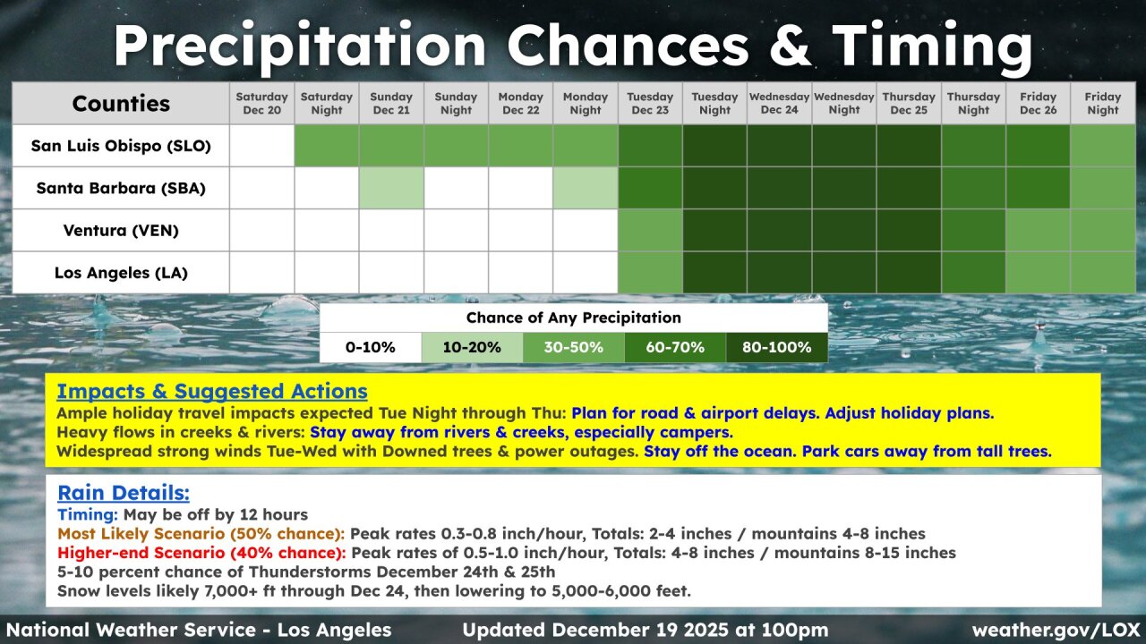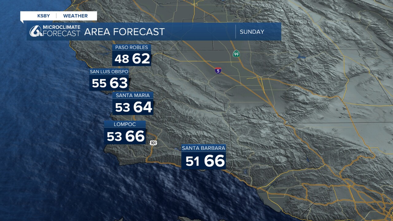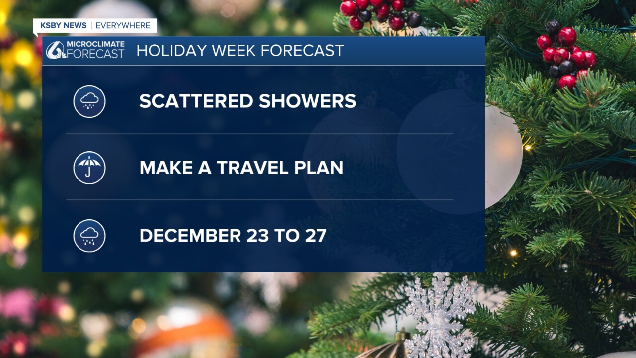 Here is what those scattered showers will look like on Sunday. It will start in those early morning hours and continue throughout the day. Again, it will mostly stick to the northwestern part of SLO County. If you plan to head to Southern California for the holidays by road, start this Saturday or plan to do so on Sunday or Monday.