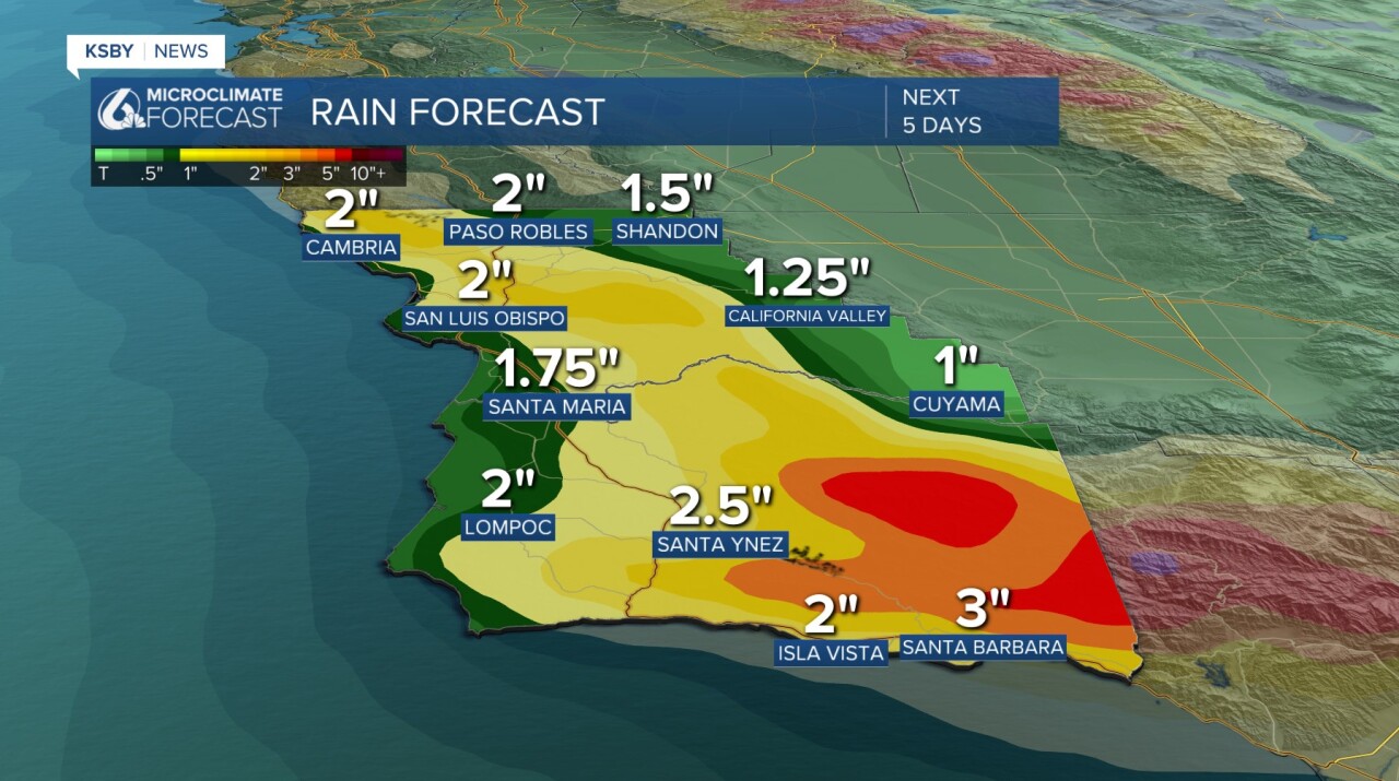 As far as what is left in the system, we can expect inches of rain, with the highest totals at the peaks of the Los Padres National Forest. Totals from the storm overall are expected to be around 4 inches for most spots but closer to 10 at the highest peaks on the south coast.