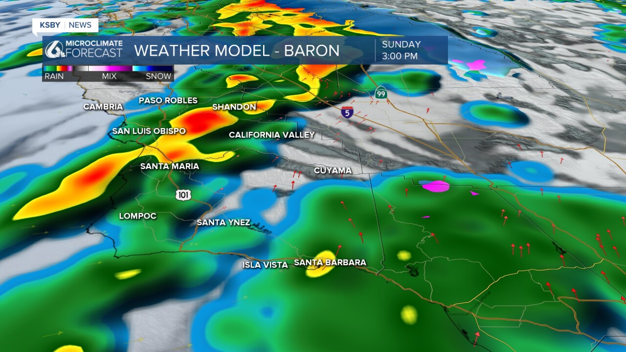 After the overnight rain we received, we've been experiencing light showers on Saturday evening. This will continue into those overnight hours, but change when the next band of rain starts to arrive Sunday afternoon. Expect heavier rain to start a little before noon. Here is a look at what rain conditions will look like on Sunday at 3:00 PM.