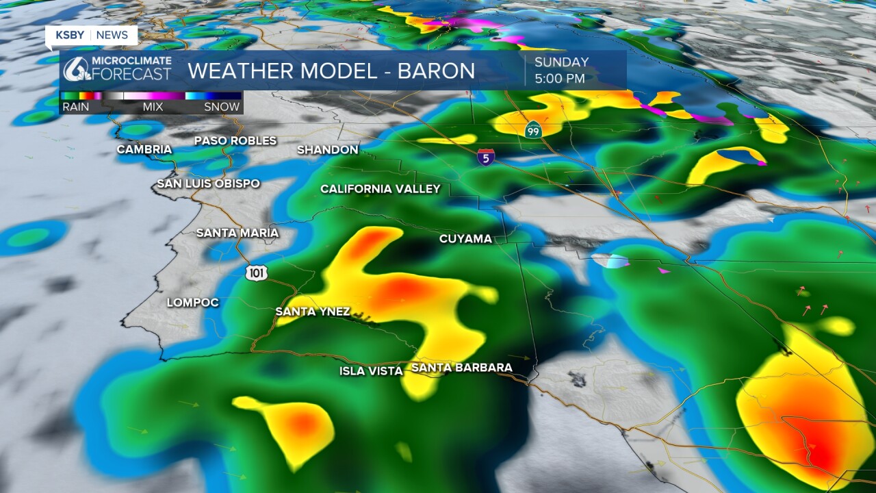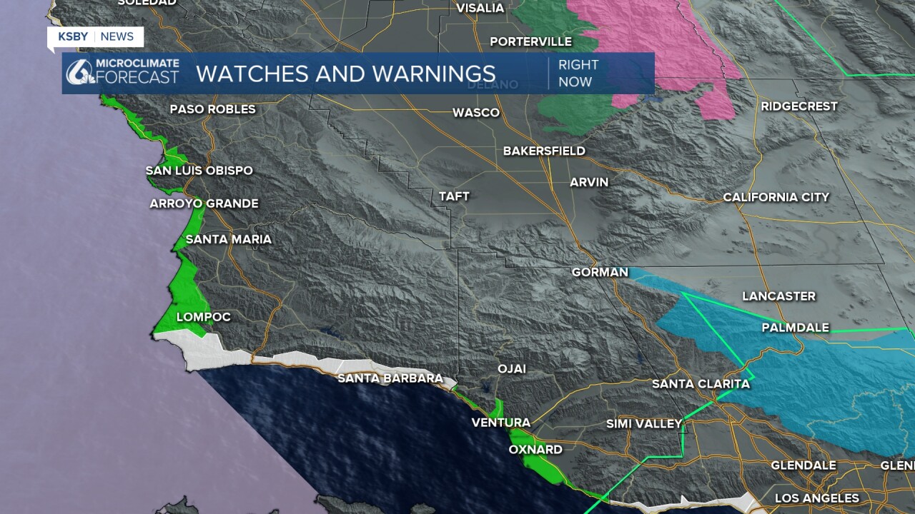 Alright, now let's talk about the Flash Flood Warning that was issued Saturday morning for the Southeastern part of Santa Barbara County. This warning ended a few hours later, around 2 PM. As a result, we reported on road closures, including those on Highway 101. As of 7:05 PM, the southbound #2 lane is open, but all northbound lanes remain closed, according to the California Highway Patrol. There are still advisories in place that are set to end on Monday. These include a Small Craft Advisory (purple), a Beach Hazards Statement (white), and a High Surf Advisory (bright green).