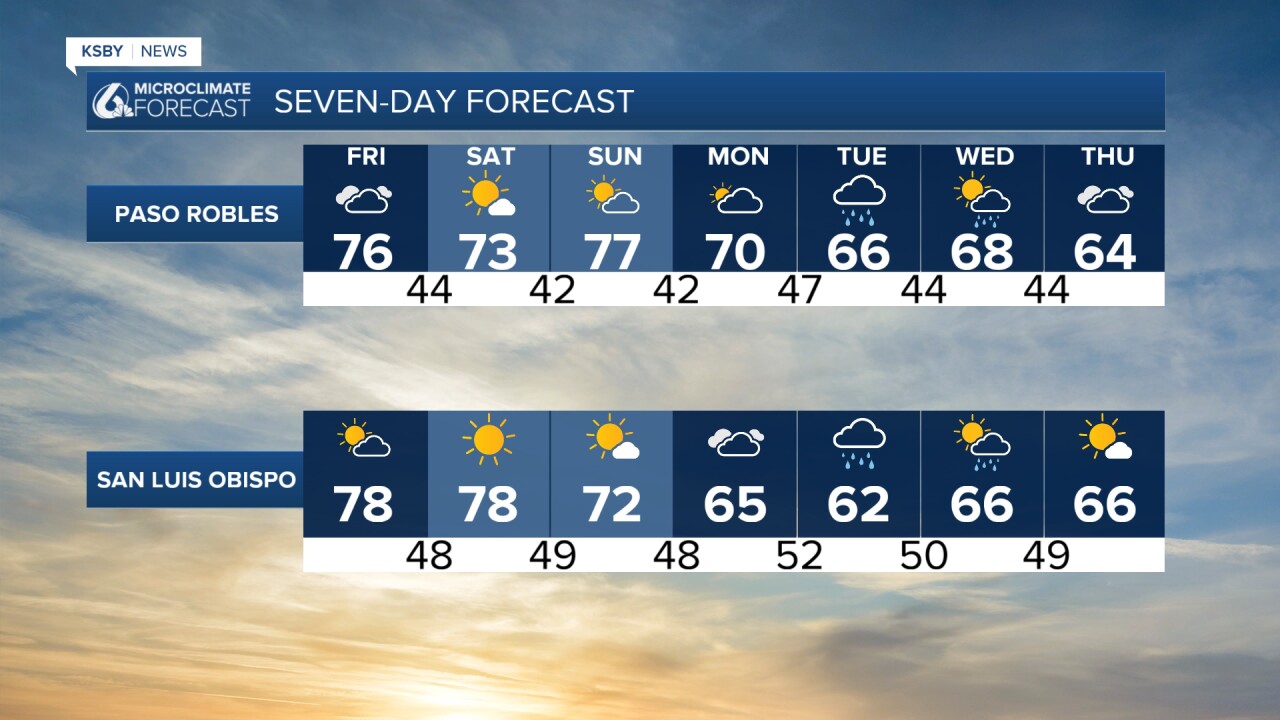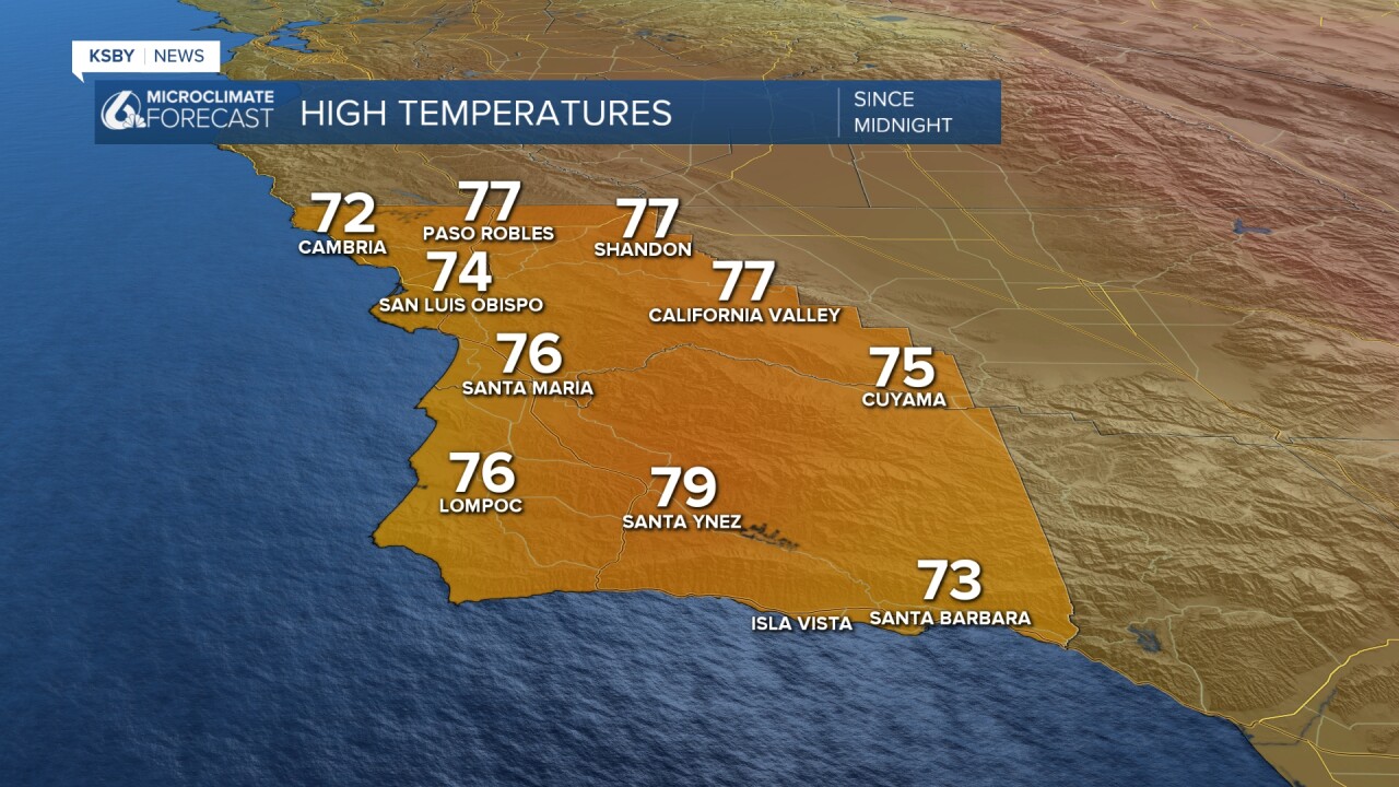 It was a great day across the Central Coast with lots of sunshine and mild weather across the region. Once again, temps stayed in the mid-70s across the region. Here is a look at the high temps from Thursday afternoon.