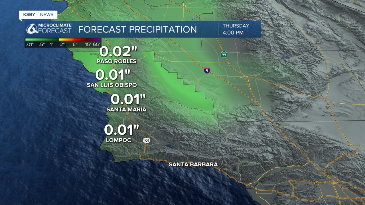 Tuesday night through Wednesday, the southern end of a low-pressure system will reach California. This cold front will pass through SLO and SBA Counties and leave the area by late Wednesday evening. Rainfall totals at the moment look to be a tenth of an inch, nothing too crazy, but I still wanted to point it out. The northwestern part of the county could experience more rain, an estimated two-tenths of an inch.