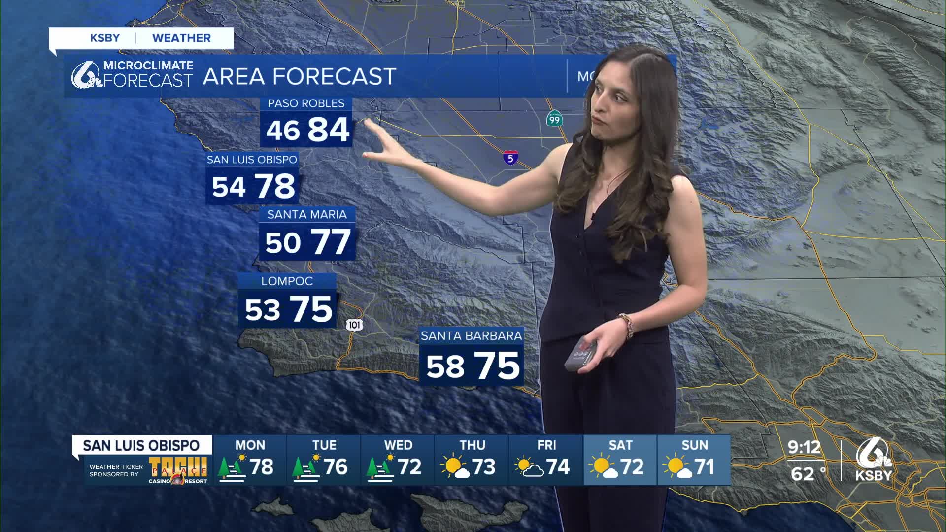 Currently. there is a weakened low-pressure system sitting just off the Central Coast. Monday and Tuesday will be a little bit warmer compared to Sunday. Despite this slight warm-up, temperatures in the Central Coast are still cooler-than-normal. This weakened system is expected to move inland on Wednesday, dropping our temperatures at most by one or two degrees.