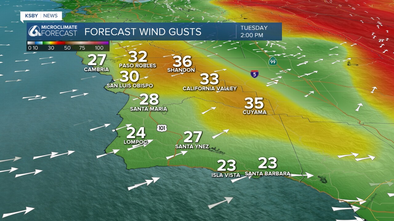 WIND CONDITIONS Gusty southwest winds of 20 to 40 mph are expected through Tuesday across both counties. Wednesday through Friday brings a shift to west-northwest winds, with advisory-level gusts of 30 to 50 mph possible late Tuesday through early Thursday. The Santa Lucia Mountains, Santa Ynez Mountains, and interior Los Padres National Forest areas will experience the strongest winds, though coastal areas may also see periods of gusty conditions.
