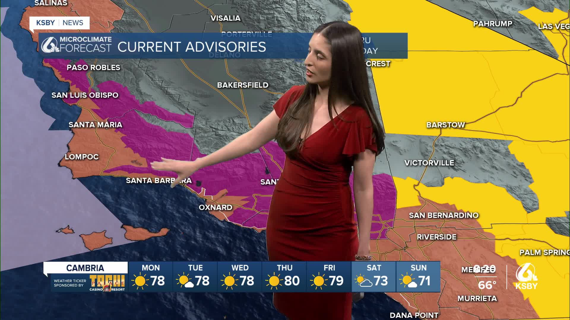 There are several advisories, watches, and now warnings for many communities across California. A Heat Advisory is in effect (orange zones) for coastal and valley communities of the Central Coast through Friday. By Wednesday, we expect these valley communities to warm up significantly.