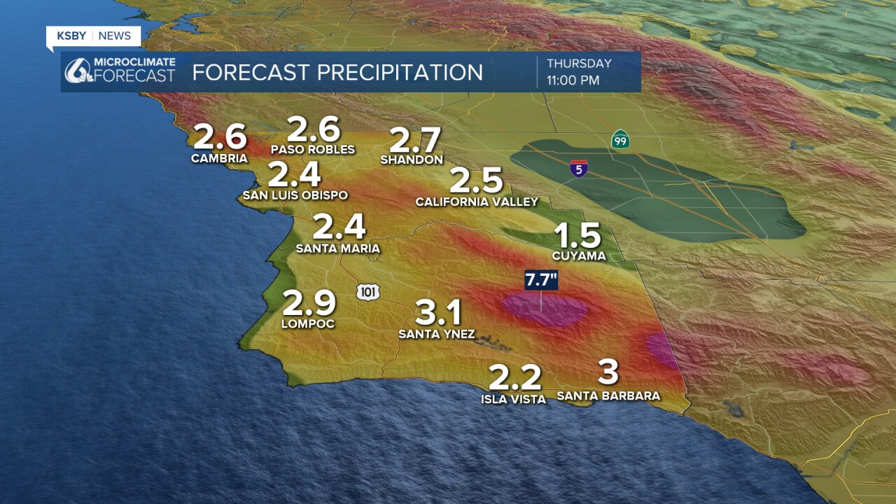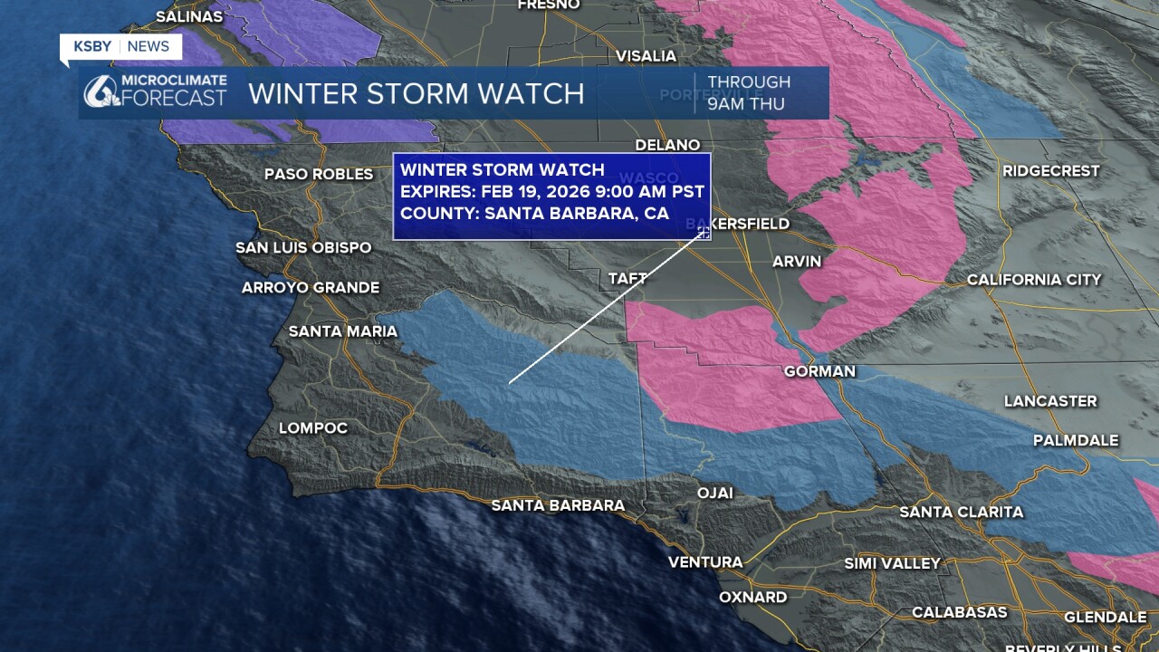 Heavy rainfall is expected for the afternoon hours with snow levels falling to around 2,000 ft into the evening. That will bring some snowfall accumulations for the peaks of the Los Padres National Forrest. A Winter Storm Watch is in effect through 9 a.m. Thursday.