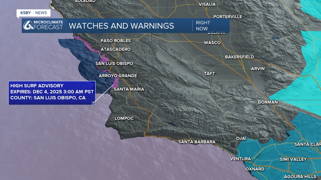 There are a few advisories in place for the Central Coast. Currently, the areas highlighted in purple are under a High Surf Advisory, which includes Avila and Pismo beaches. There is also a Small Craft advisory for the regions highlighted in the lighter purple, which ends Monday at 3:00 AM.