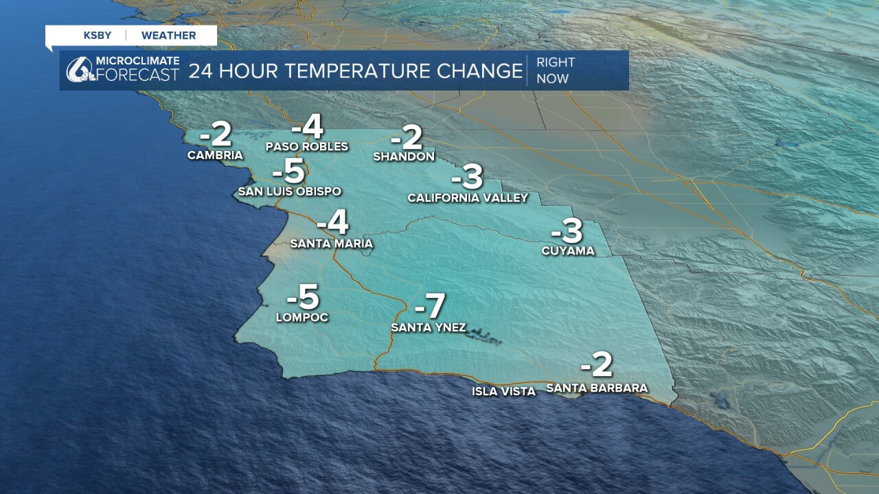 As previously mentioned, this cool-down is not drastic. Santa Ynez seems to be the location that experienced the biggest drop in temperatures, a 7-degree cool down in the last 24 hours.