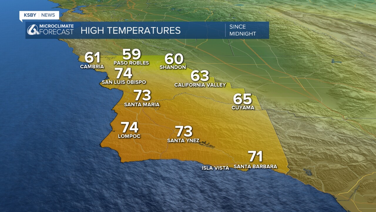 Highs in the coastal valleys climbed into the 70s while interiors stayed near 60. Here is a look at the temps we saw today.