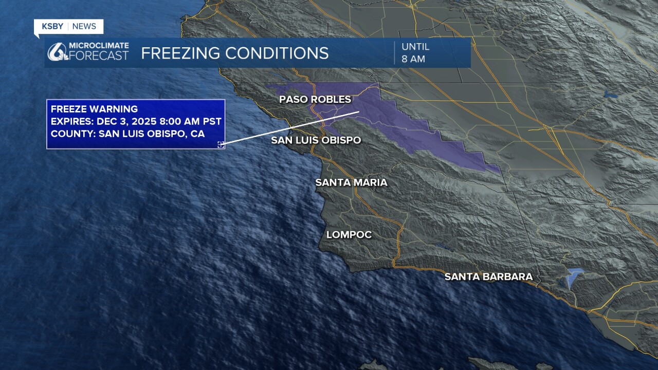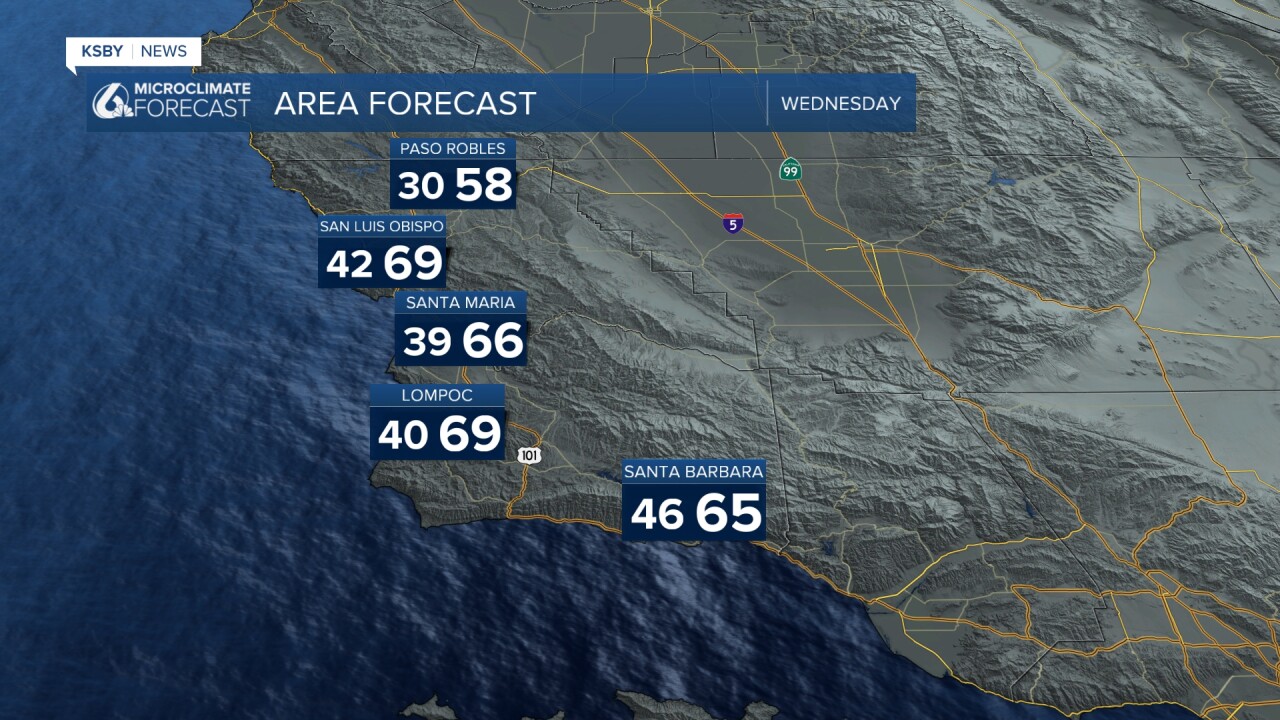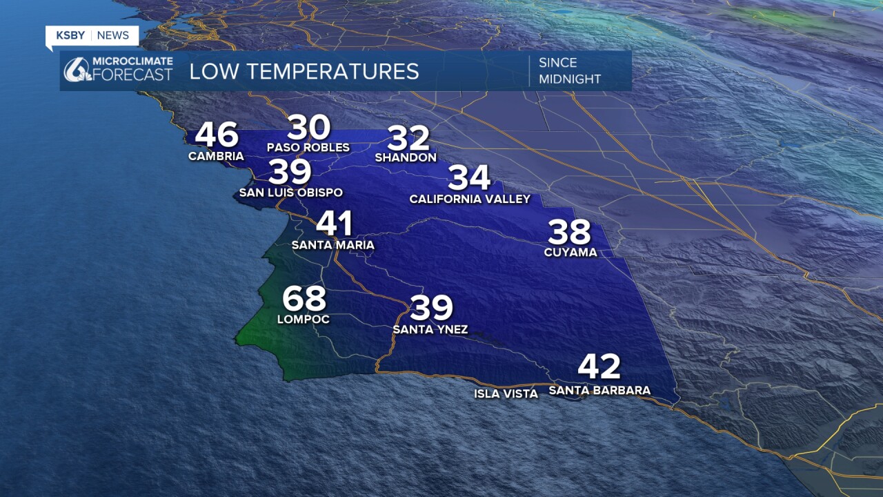 Those lows in the 30s will stick around for another night. This has prompted another freeze warning for the interior valleys through 8 a.m. Wednesday morning. The difference between this alert and yesterday's is that it has expanded slightly and now also includes Paso Robles, Templeton, Atascadero, and Lake Nacimiento.