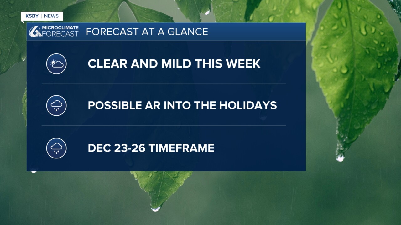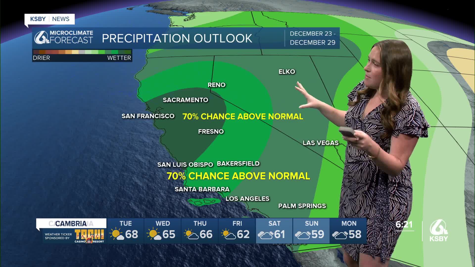 The change starts with a cold front barreling down the coast. That will bring us cloud cover into the weekend and create a slight dip in temperatures. That will also open the door for a much larger change in the forecast. There is the potential for a large-scale storm system to impact the West Coast somewhere between the 23rd and 26th of December.