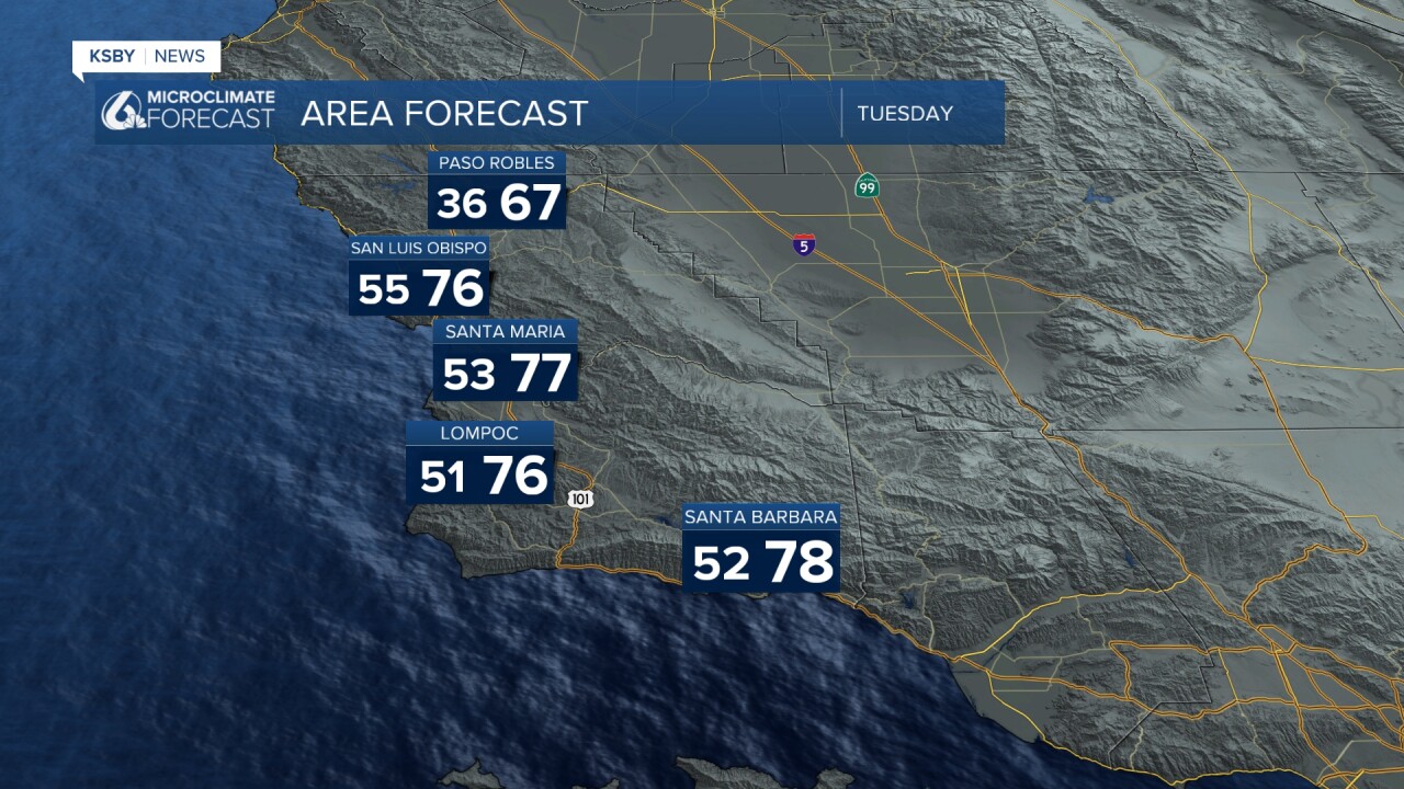 Tuesday, the rest of our communities will join SLO with warmer temperatures and another round of the dense morning fog for our beaches and coastal valleys. The fog will clear out a bit quicker Tuesday morning, so that is a bonus at least!