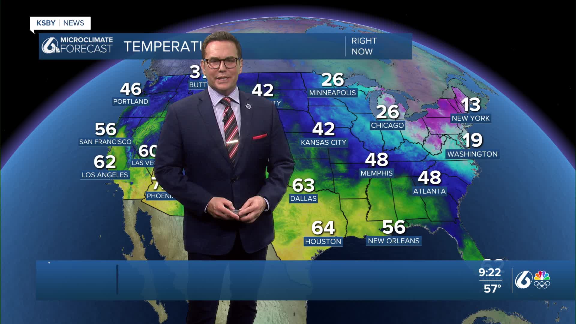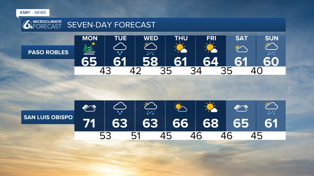 Above-normal temperatures continue into Monday around the Central Coast, and clouds increase, but we remain dry. A weak storm system crosses the region Tuesday and Wednesday, with light to moderate showers expected across the entire area.