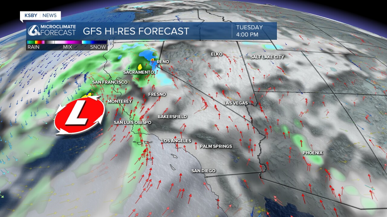 Below is a snapshot later in the day on Tuesday when light to moderate showers begin moving onto the Central Coast.