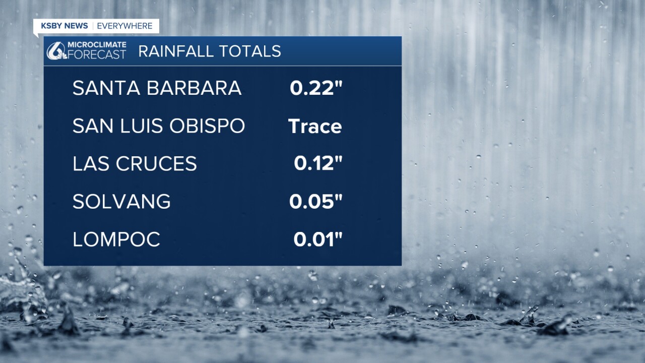 Below are the rainfall totals from the weak weather system that continues moving through the Central Coast. Santa Barbara almost had a quarter of an inch of rain.