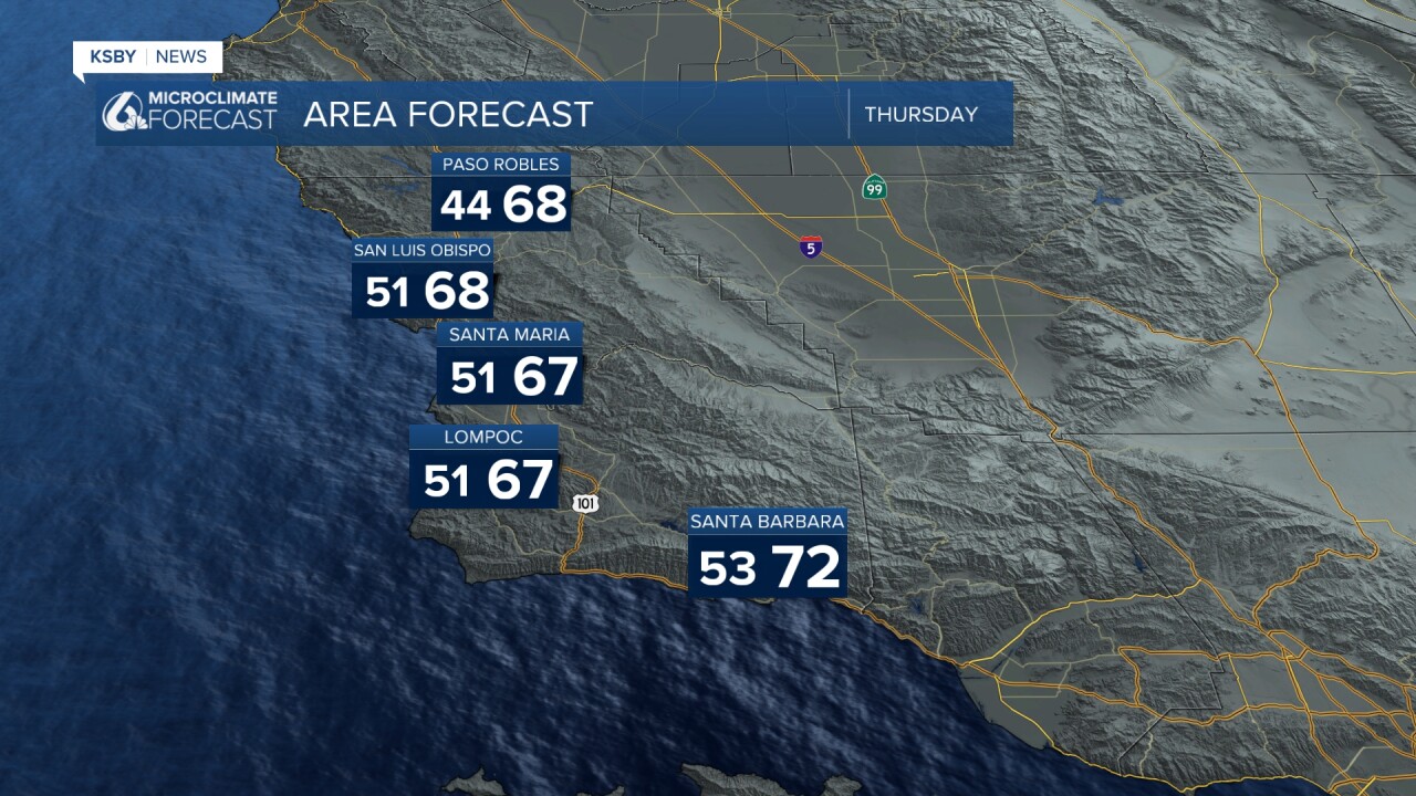 Thursday night gusty Sundowner winds: Things will get breezy Thursday night as gusty northeast winds develop, particularly in areas like the Gaviota Pass, Refugio, and parts of southern Santa Barbara County. Sundowner wind gusts could reach 35-45 mph in these typical windy spots. A Wind Advisory has been issued for the interior mountains of Santa Barbara County and the Eastern Santa Ynez Range starting at 11 pm on Thursday until 5 am on Friday.