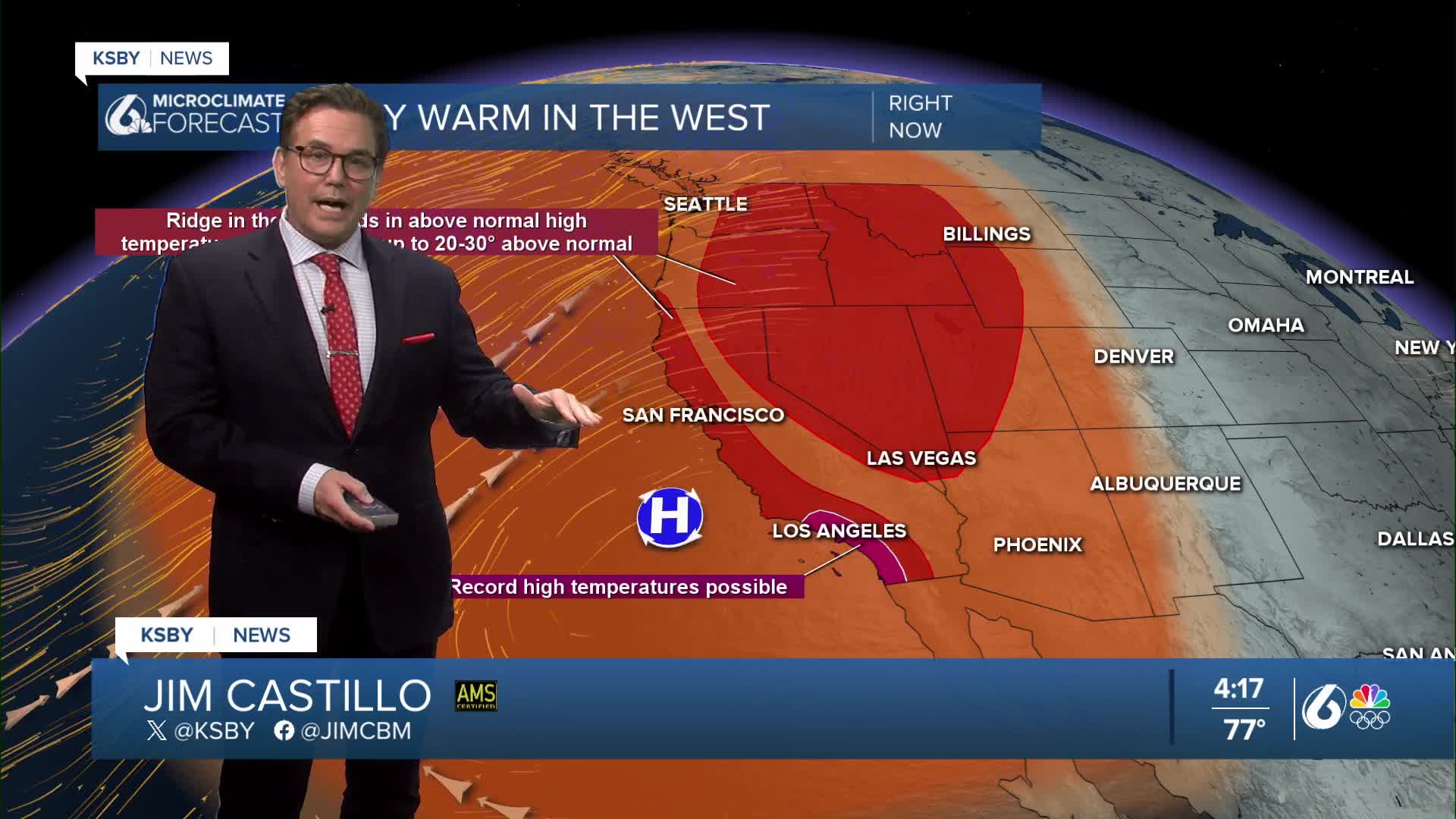 Our January warm and dry stretch is a result of ridging aloft and offshore winds at the surface. Later Sunday, a weak low-pressure system will impact the region, bringing a brief period of onshore flow and slightly cooler temperatures. The marine layer is likely to reform Sunday night into Monday, and areas of coastal low clouds and fog are possible. Monday will be the coolest day of the week, but still likely to be near normal to several degrees above normal.
