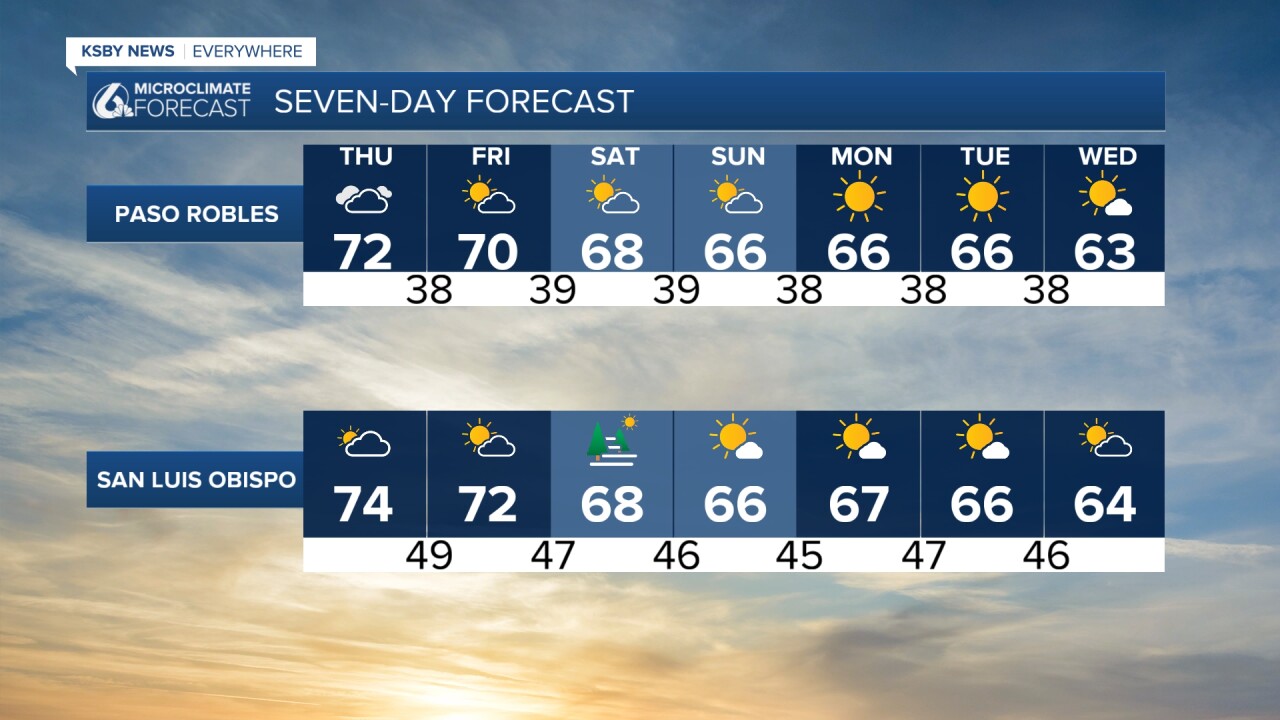 The San Luis Obispo, Santa Maria and Santa Barbara areas will see the opposite. Fog is projected to come into town on Saturday but will blend into more cloudy conditions by Sunday.