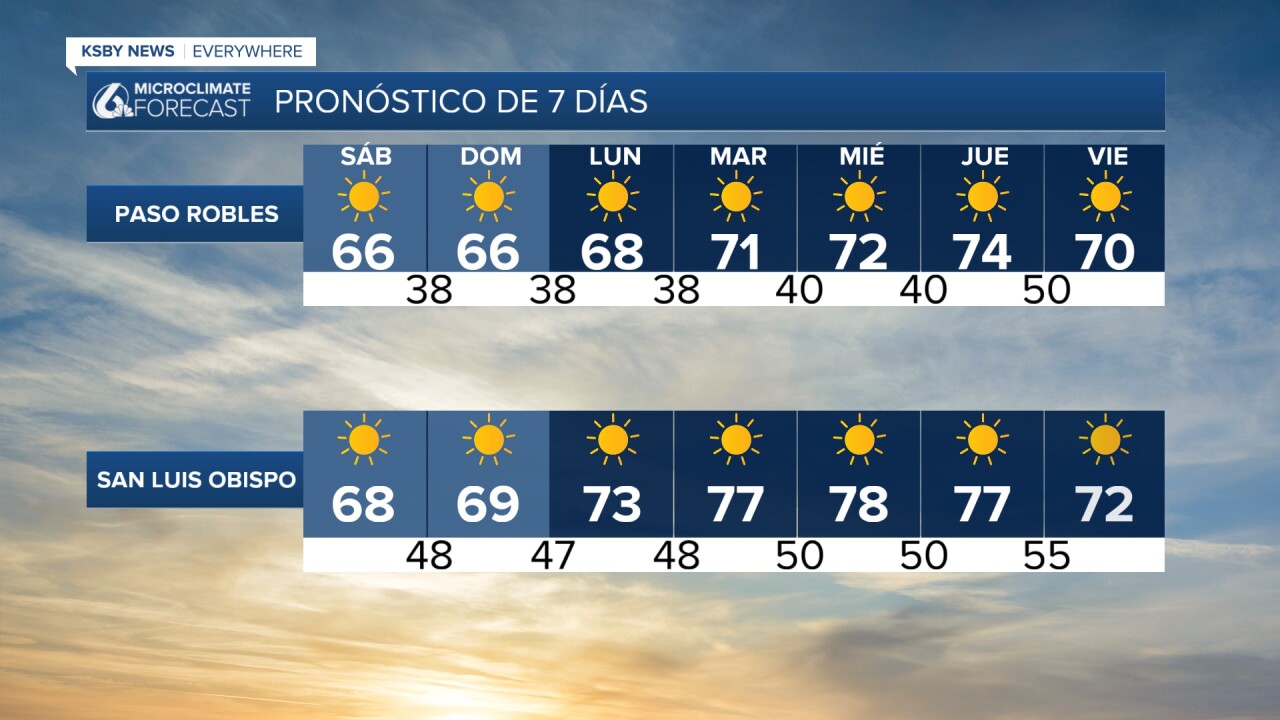 A high-pressure system is the reason why we'll begin to experience a warm-up. Paso Robles will reach the 70s by Tuesday, and San Luis Obispo by Monday.