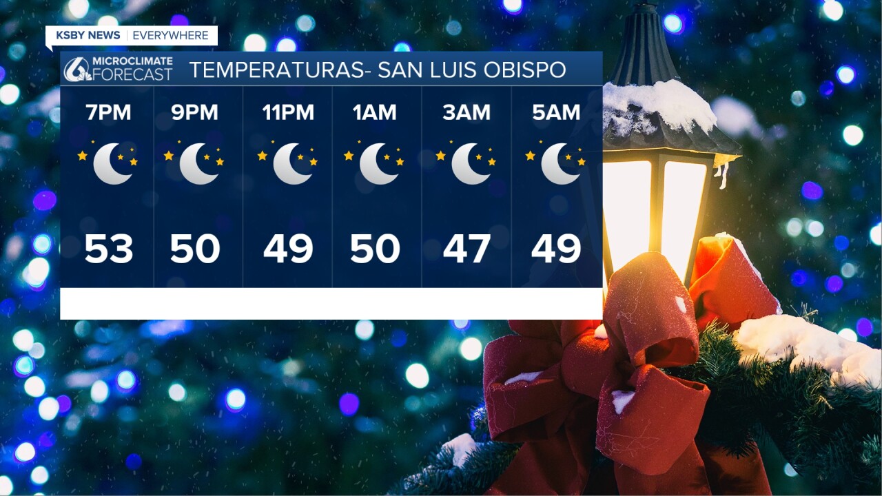 ¡Ya estamos en pleno espíritu navideño! Este fin de semana habrá varios eventos en la Costa Central para celebrar el comienzo de la temporada navideña. Hoy la ciudad de San Luis Obispo tendrá su desfile festivo, el cual comenzará a las 7 de la noche. Si planeas asistir, la siguiente imagen muestra las temperaturas esperadas. Mi consejo: lleva un abrigo o dos.
